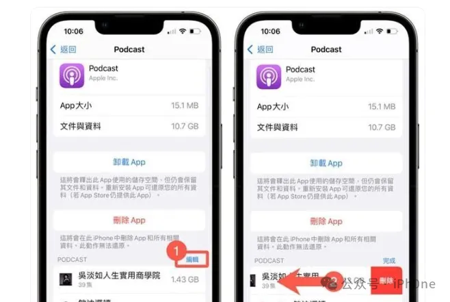 要是经常收听 Podcast 节目,每次在聆听时,都会造成 Podcast暂存越来越肥大,可以直接到“设定”>“一般”>“iPhone储存空间”内找到“Podcast”,点选“编辑”删除所有 Podcast 节目暂存。方法6. 清除或卸载不常用的APP或游戏