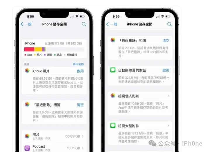 最后是暂存资料或不需要的垃圾文件太多,在iPhone储存空间也会看见建议选项,可以点选“显示全部”,裡面会根据当前 iPhone 设备提供多种解决方案,像是移除最近删除相簿、自动删除信息和复建等。通常只要透过前面操作步骤做过一次,基本很少会看见这些选项,除非是没有使用iCloud照片备份才会出现建议启用“iCloud照片备份功能”。方法9. iPhone重开机一次