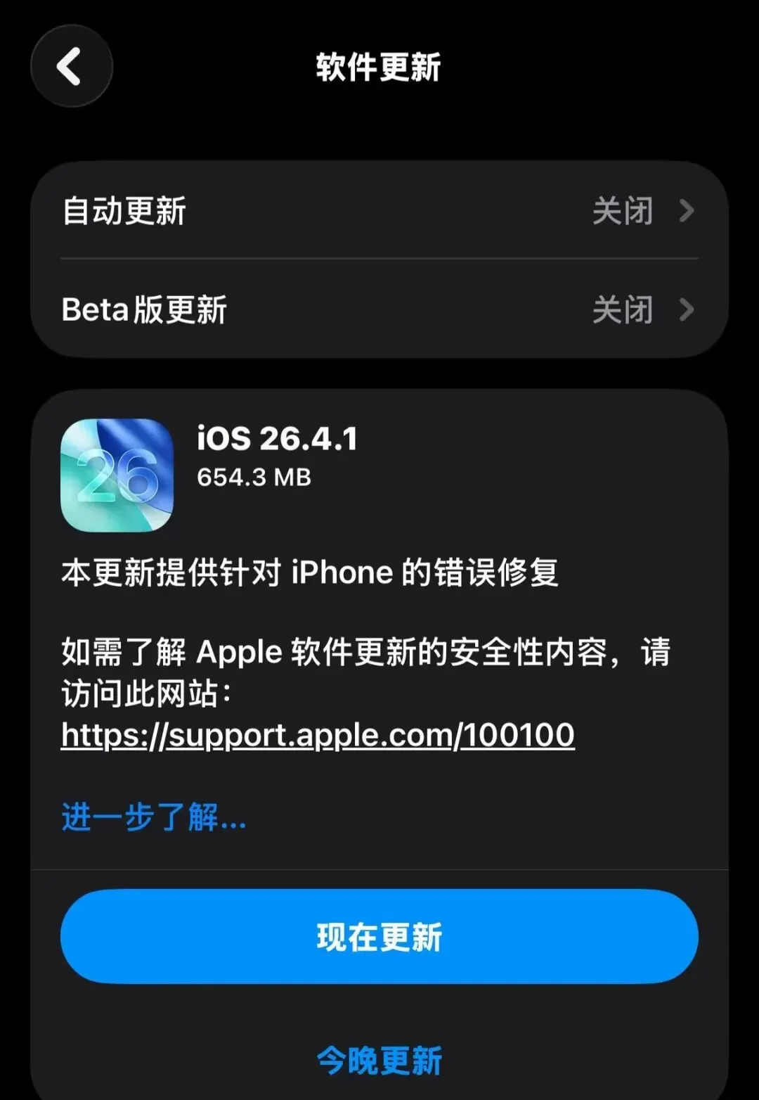 北京时间4月9日凌晨,苹果正式推送iOS 26.4.1系统更新,本次更新包大小为600M,属于针对性的紧急修复版本,并未新增任何功能,仅聚焦于Bug修复与安全补丁更新。