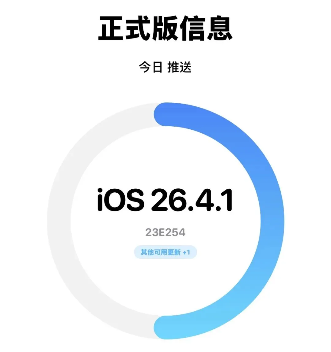 来了,今天凌晨苹果正式推送 iOS 26.4.1正式版,版本号 23E254