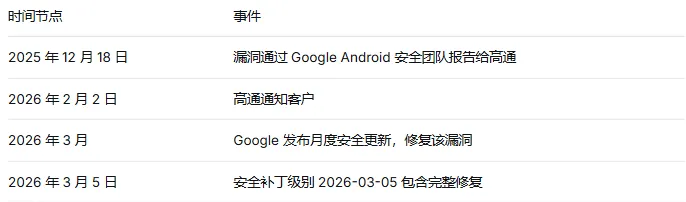 Google在2026年3月的安全公告中指出,有迹象表明该漏洞正遭受"有限的、有针对性的利用"。由于Android生态的碎片化,补丁无法立即覆盖所有设备,各设备制造商需要时间进行适配测试。