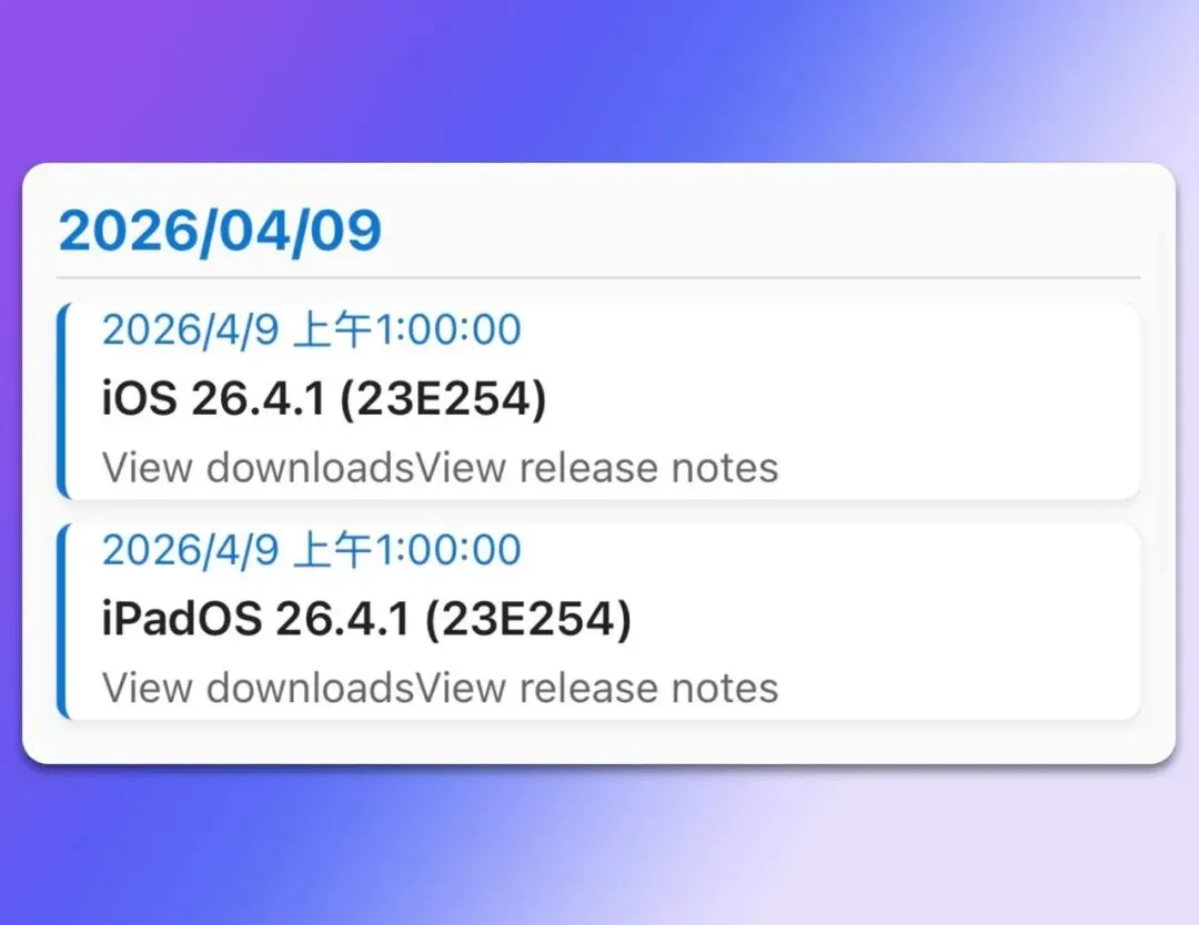 今天凌晨,苹果向用户推送了 iOS 26.4.1 和 iPadOS 26.4.1 正式版系统,版本号为:23E254,距离上个正式版仅间隔两周多时间。