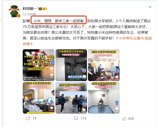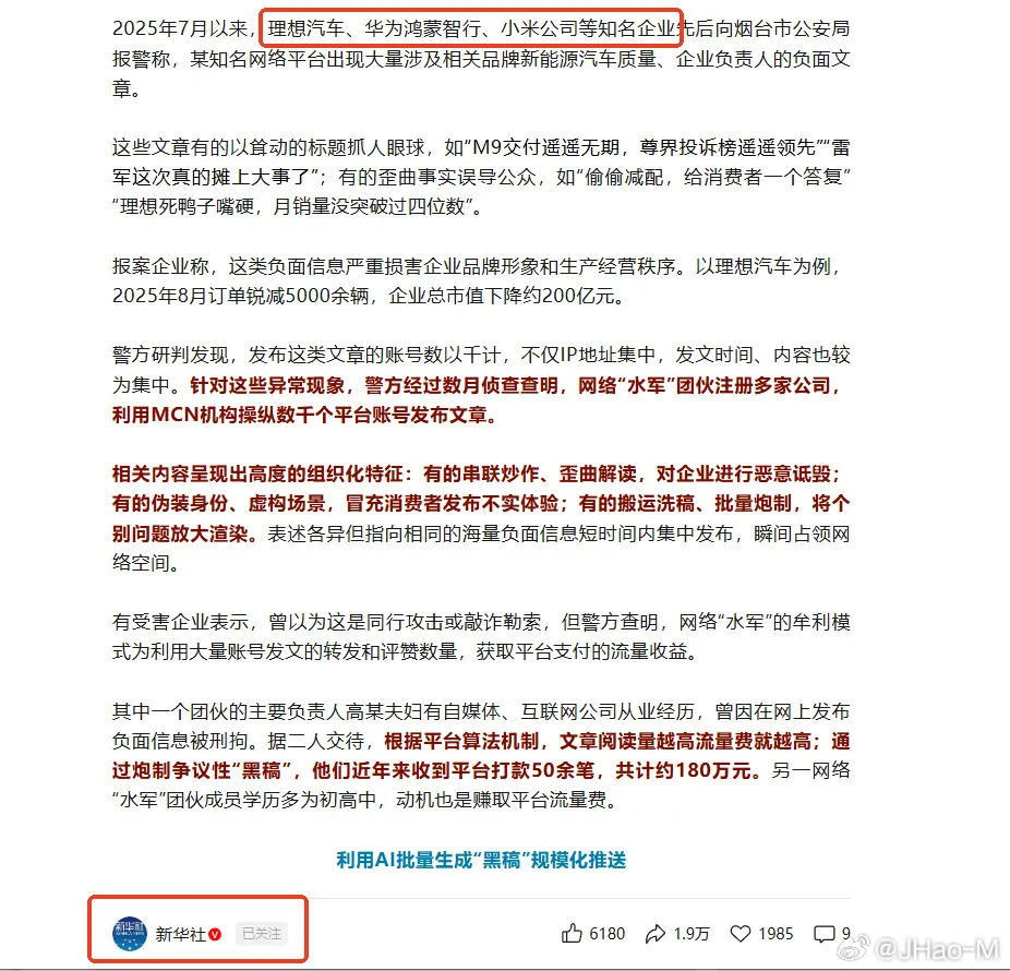 不知道为什么这个博主对华为鸿蒙智行遭到黑水军只字不提,只说小米,理想,蔚来三家车企报警?