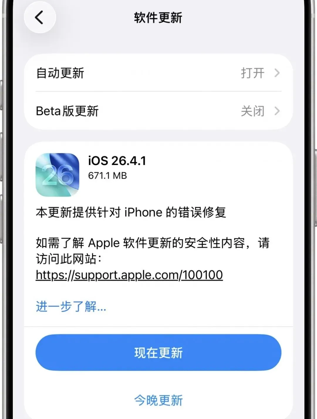 iOS 26.4.1 属于小更新,如果你的 iPhone 运行 iOS 26.4 系统,遇到了 iCloud 数据不同步问题,可以更新到 iOS 26.4.1,其它版本没必要更新。