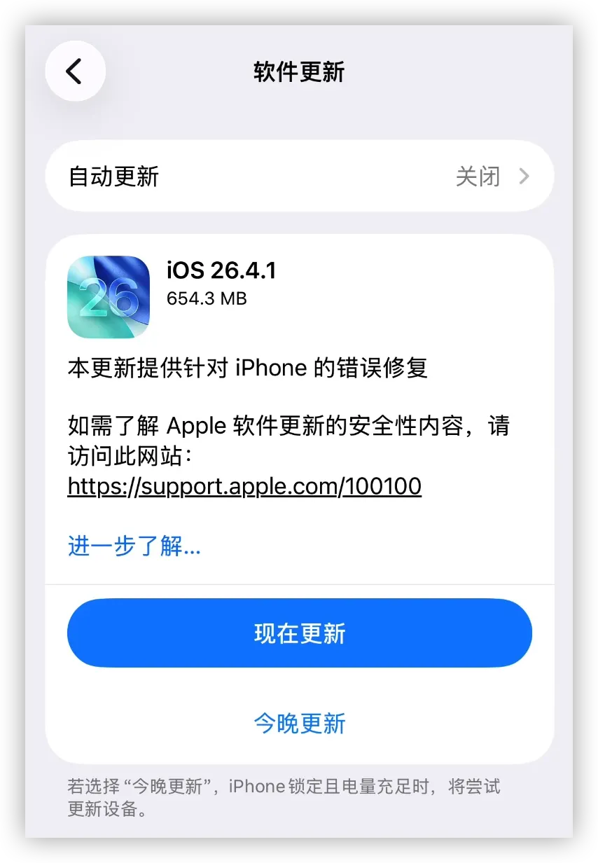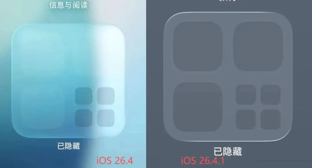 正如我们预料的那样,今天凌晨,苹果悄悄发布了 iOS 26.4.1 正式版更新。iOS 26.4.1 的系统版本号为 23E254,距离上次更新一周之隔。已升级 iOS 26 的用户,就可以收到 iOS 26.4.1 的更新推送了。整体来看,iOS 26.4.1 并未带来任何新功能,主要是修复 Bug。更新日志显示,iOS 26.4.1 提供了针对 iPhone 的错误修复。但来自开发者论坛的一个帖子显示,iOS 26.4.1 重点解决了一个与 iCloud 数据同步相关的漏洞。在 iOS 26.4 中,部分 iPhone 机型无法接收到 iCloud 的更改通知。这意味着使用 CloudKit 架构的应用(比如苹果自家的密码 App),将受到该问题的影响。现在,苹果终于在 iOS 26.4.1 中修复了这个问题。在之前版本中,App 资源库中的隐藏文件夹图标,可能会在深色模式下出现异常显示。而在 iOS 26.4.1 中,开启深色模式后,相关图标统一为深色风格。在 iOS 26.4 中,苹果悄悄将「失窃设备保护」功能设置为默认开启状态。在苹果支持页面上,官方确认了一项基于企业版 iPhone 的变更。从 iOS 26.4 更新到 iOS 26.4.1 的设备,将自动启用失窃设备保护功能。