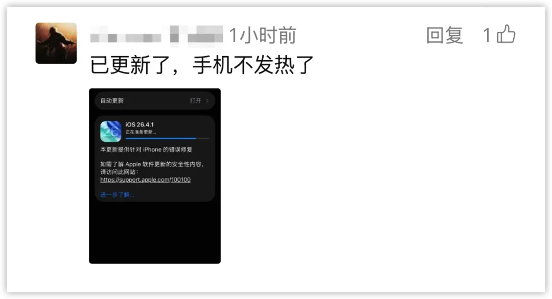 而「失窃设备保护」功能的默认开启,显然也能帮助企业设备规避丢失风险。最后,对大多数用户来说,新系统的稳定性显然是最值得关注的。结合社交平台反馈,大多升级 iOS 26.4.1 的用户,均给出了不错的评价。尤其是在改善发热问题这一块,iOS 26.4.1 的表现确实有目共睹。此前受到以上问题困扰的用户,建议升级至 iOS 26.4.1,以获得更稳定的使用体验。当然,如果你想停留在当前版本养老,也可以通过一个描述文件来屏蔽系统更新。感兴趣的小伙伴,现在就可以进入果粉俱乐部公众号,点击右侧下方的「发消息」,回复关键词「屏蔽」获取描述文件。将链接复制至 Safari 浏览器打开后,按照提示下载描述文件。随后进入 iPhone「设置」,点击「已下载描述文件」。
