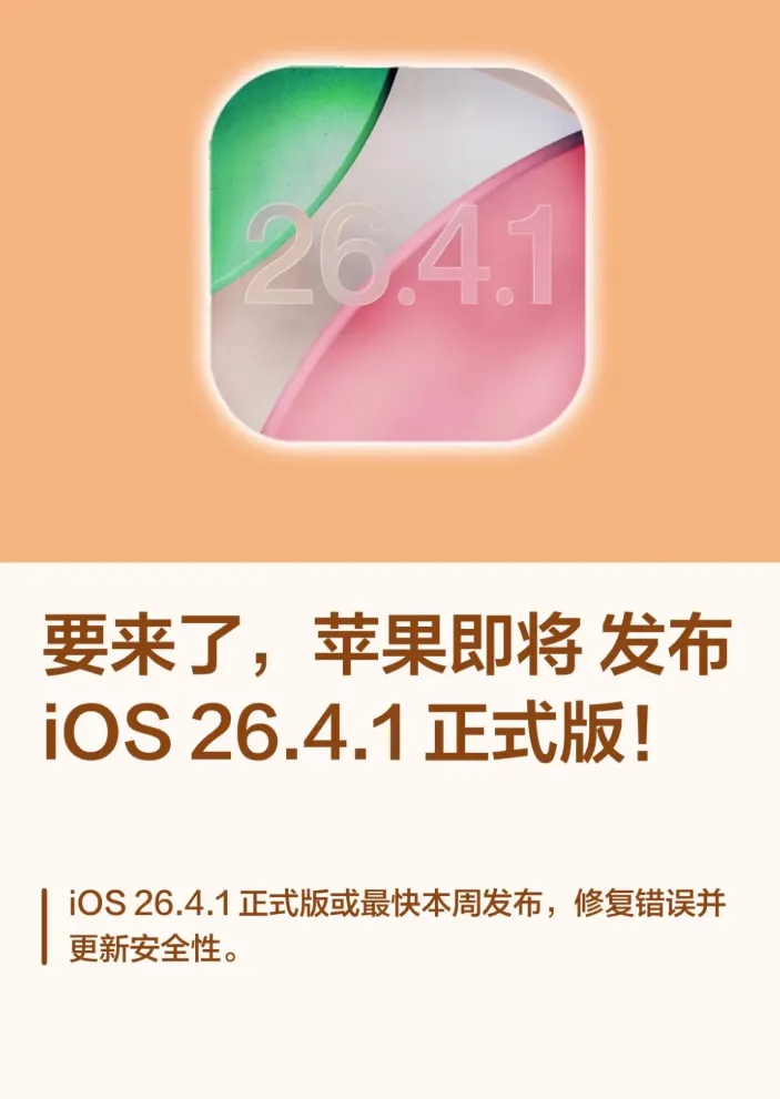 这几天外媒那边丢出一条消息,9to5Mac说有知情人透了口风,苹果给内部员工推了 iOS 26.4.1 的候选版,包大概300MB,版本号20F70,说是标准维护更新,修之前几个关键问题,补一批安全补丁,开发者这周能碰到公测通道的推送。