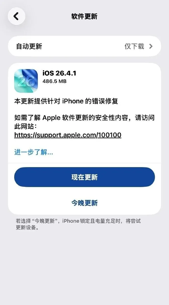 总的来说,这是一次 “实用大于花哨” 的更新,没有噱头,全是实打实的修复,解决的都是大家日常使用中最在意的问题。毕竟对果粉来说,多设备同步顺畅、续航稳定、系统不卡顿,比任何新功能都重要,而 iOS/iPadOS 26.4.1,刚好满足了这些需求。