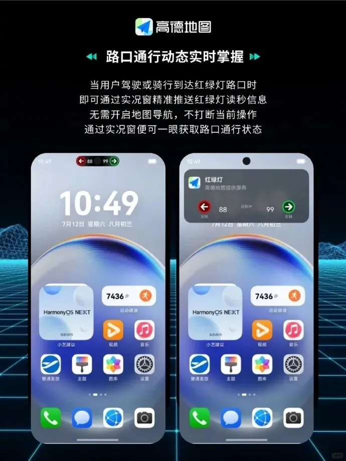 熟悉导航的朋友应该都知道,之前不管啥 APP 的红绿灯读秒,基本都得全程开着导航、挂着后台才能用,不仅占内存耗电,有时候想切个歌、接个电话还得来回切换界面,挺麻烦的。但这次高德鸿蒙版的这个新功能,算是把这个痛点给解决了 —— 核心就是不用开导航主界面,靠鸿蒙的实况窗就能实时提醒,这一点真的太戳日常出行的需求了。
