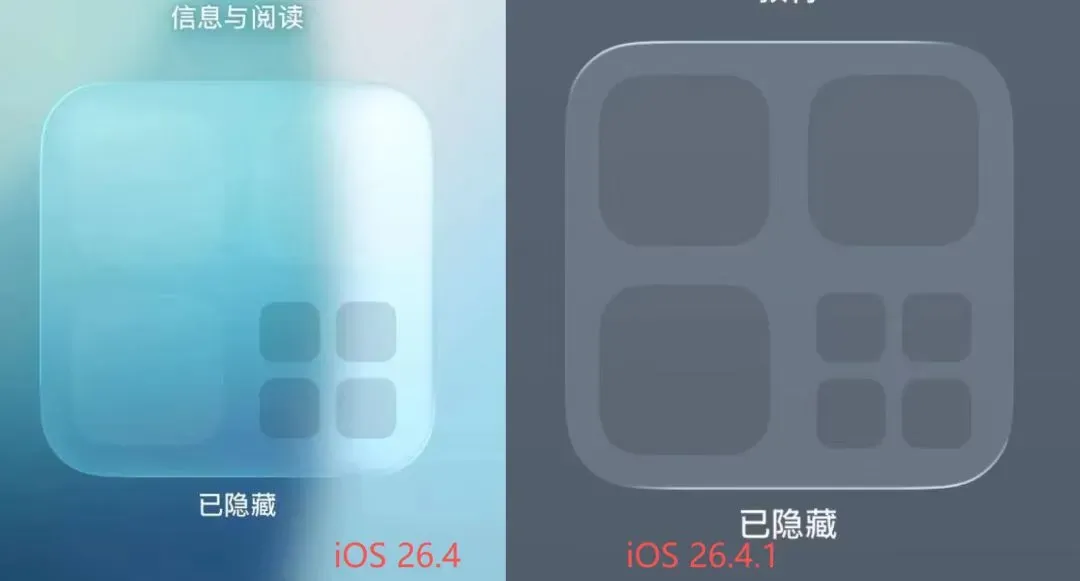 另一个细节 Bug 是,在之前的版本里,App 资源库中的隐藏文件夹图标,在深色模式下可能会出现异常显示。