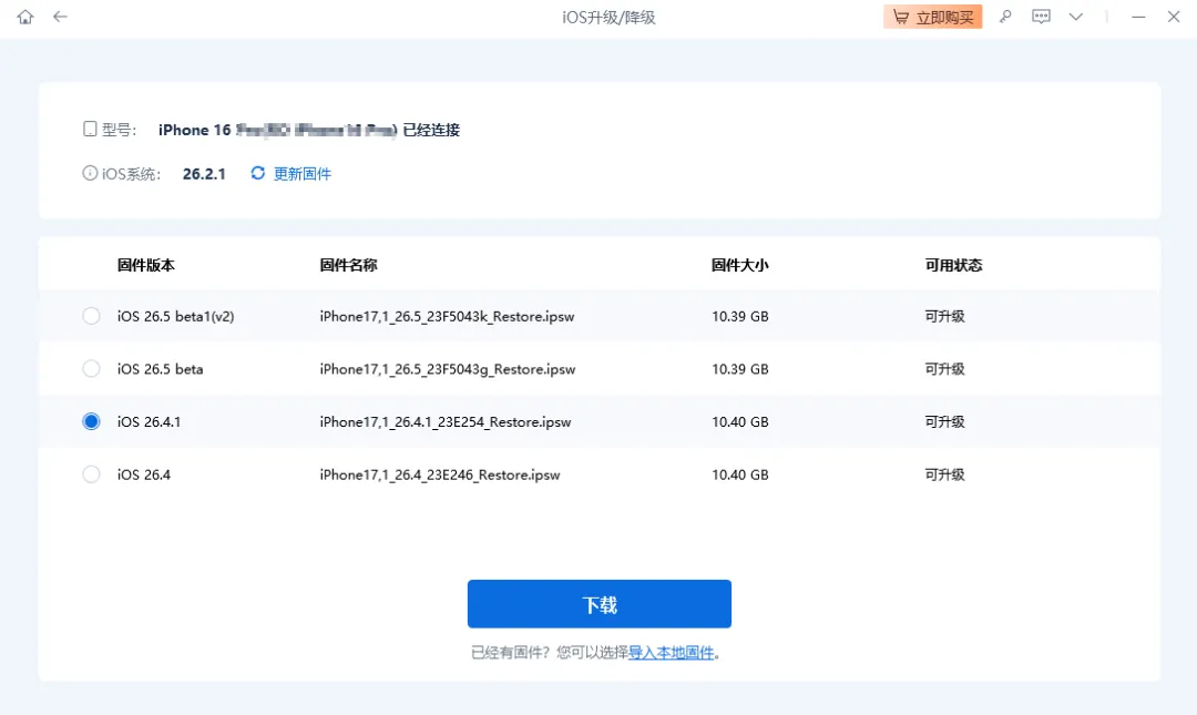 步骤3:选择需要升级的固件版本后,点击【下载】等待开始下载iOS固件