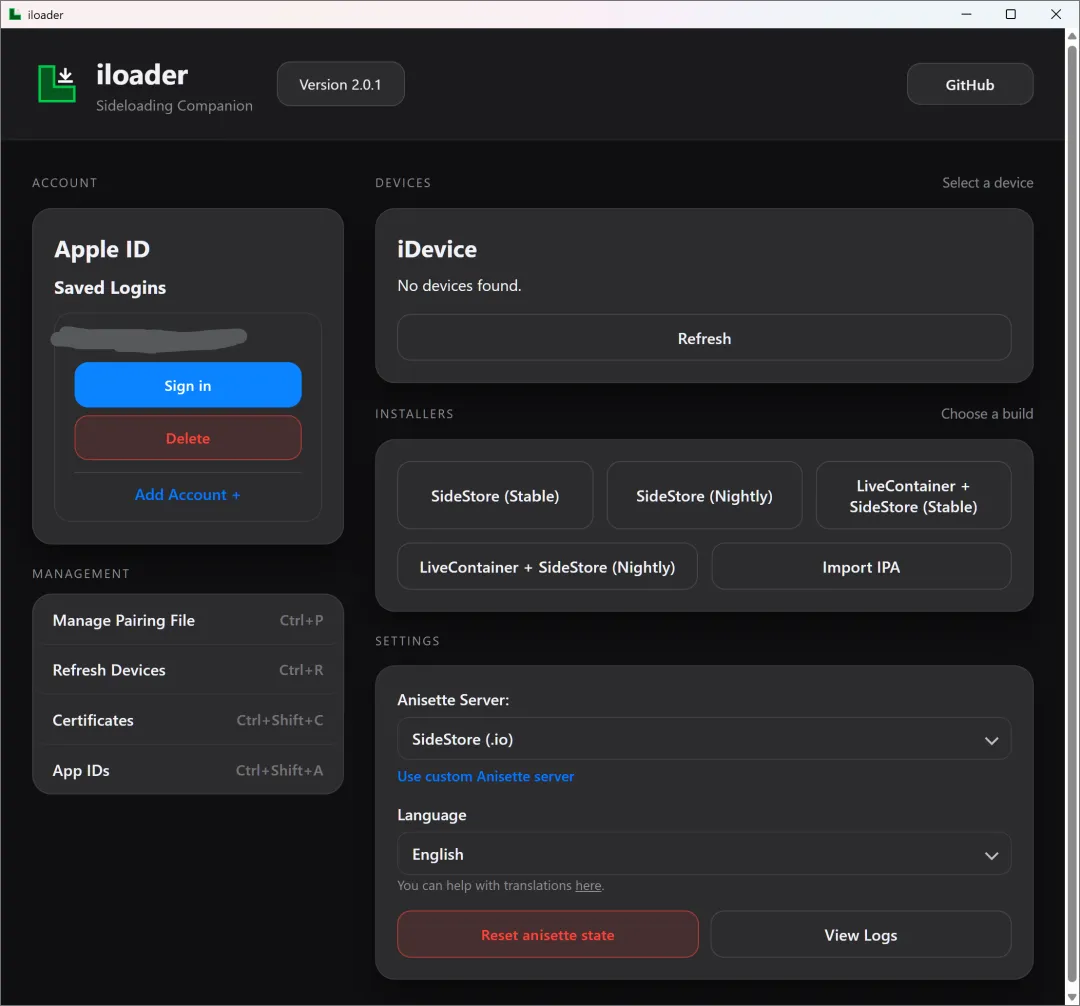 需要连接苹果设备(需要有驱动识别到设备,安装爱思助手或者iTunes或者apple devices实现)其中Refresh可以刷新设备,接着登录账号,以及用iloader安装LiveContainer + SideStore