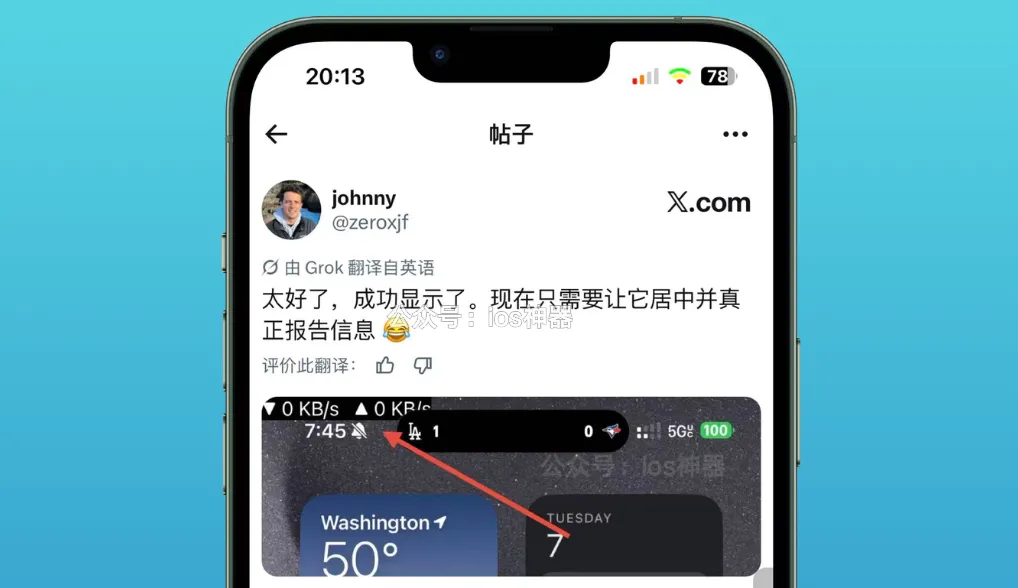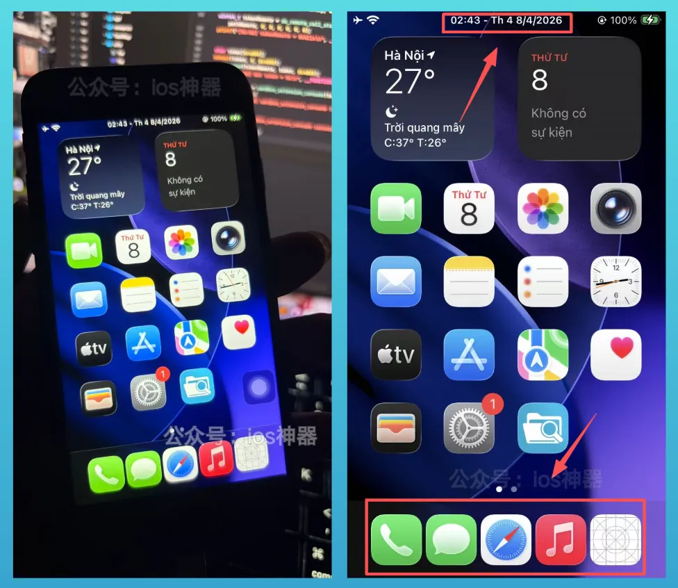 通过截图,可以发现已成功修改 5 个Dock栏+顶部时间悬浮!这就说明 Springboard 注入功能。