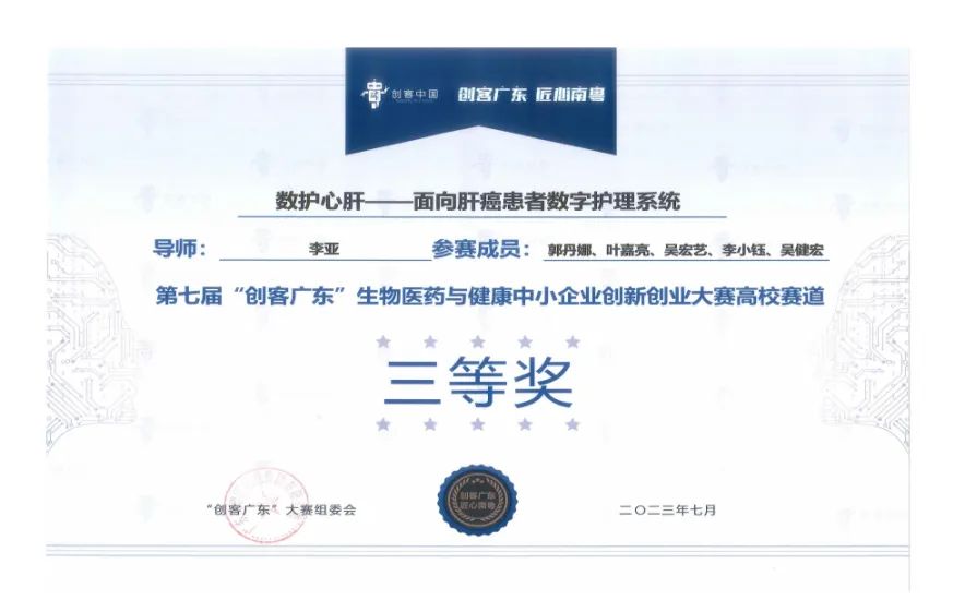 4.2023年第七届“创客广东”生物医药与健康中小企业创新创业大赛高校赛道三等奖;