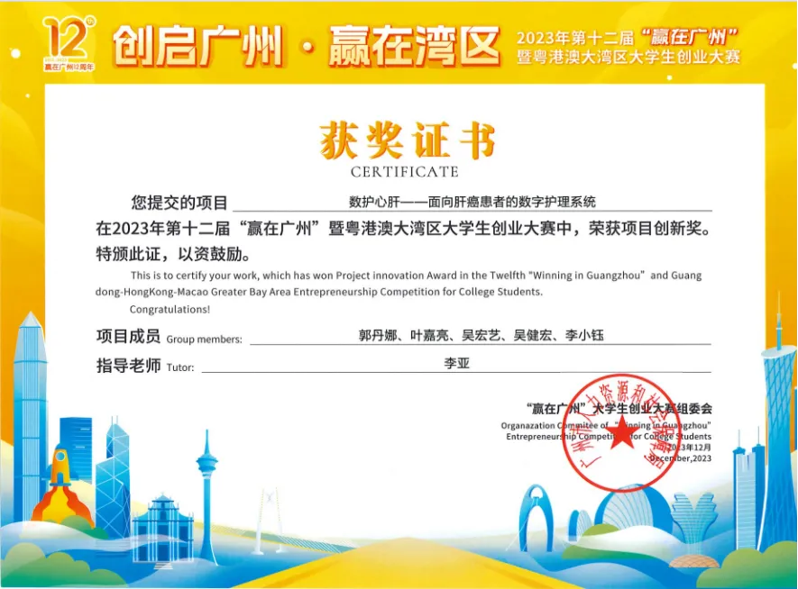 5.2023年第十二届“赢在广州”暨粤港澳大湾区大学生创业大赛项目创新奖;