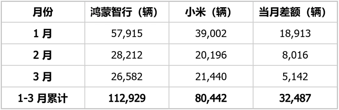 再说了,虽然一米难再穿5界,但今年前三个月,小米跟鸿蒙智行的销量差距不断在缩小。