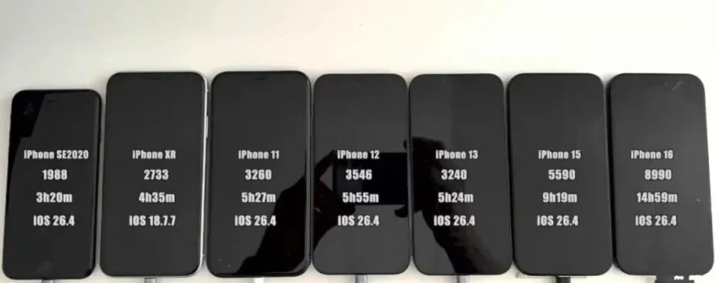 上场的机型六台,iPhone 16,iPhone 15,iPhone 13,iPhone 12,iPhone 11,iPhone SE 2020,全都刷到iOS 26.4,结果一对比,差距拉开,有的很能扛,有的掉得快,两个方向都能看到。