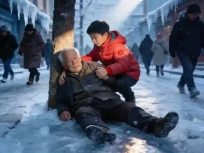 在这寒冬里,一位花甲岁数的老人,一个不小心,摔跤了。正可谓:“一失足成千古恨。”他身子佝偻着,地上的冰也化成了水,浸入了他的衣服中。