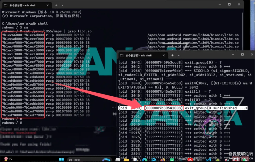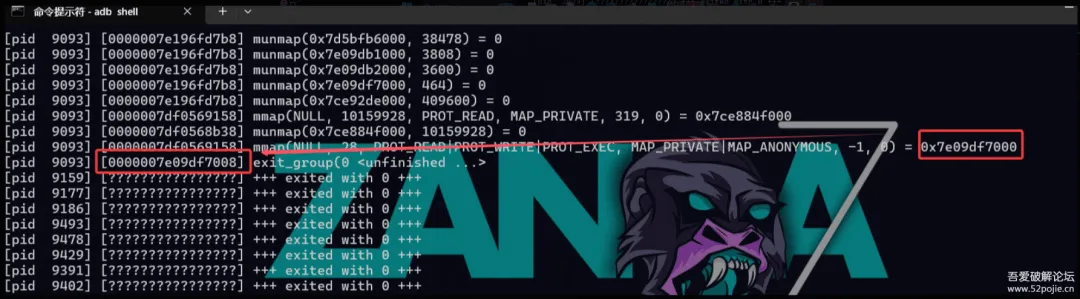 上述脚本执行之后,找到目标进程的pid之后执行命令strace -e trace=process -i -f -p "目标pid",挂载系统函数的调用监视使用strace在进入目标检测so之前挂载上之后截取了目标进程的一系列系统调用,主要关注导致进程退出的系统调用,由下图可见是在进程下面的一个线程实现的闪退效果,执行了系统调用exit_group(0 <unfinished ...>。