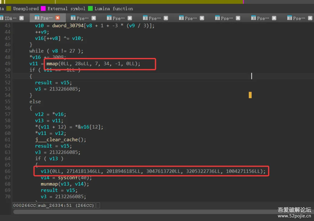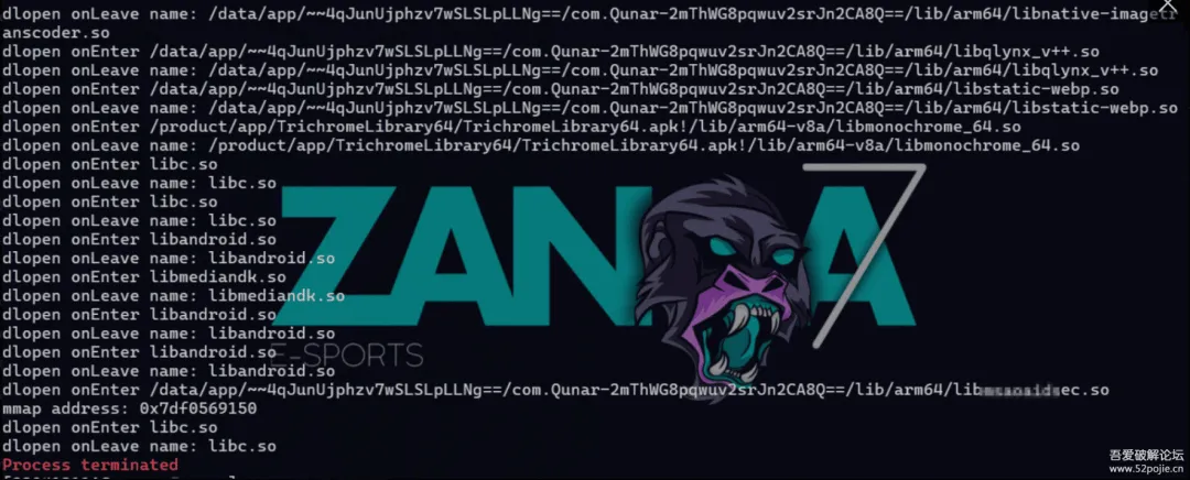 同时查看了目标进程中的libc的地址也与导致闪退的地址不符,这就说明这个内容是动态加载的,故而会有一个mmap创建内存的操作