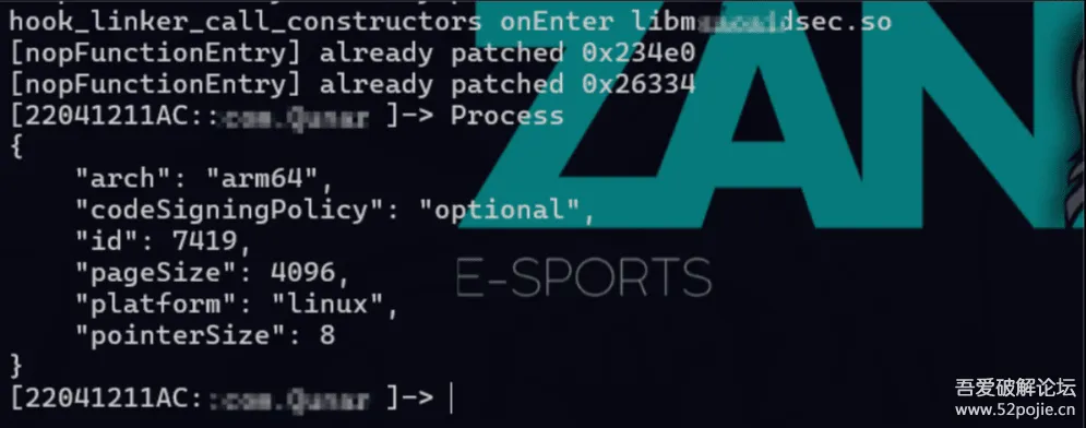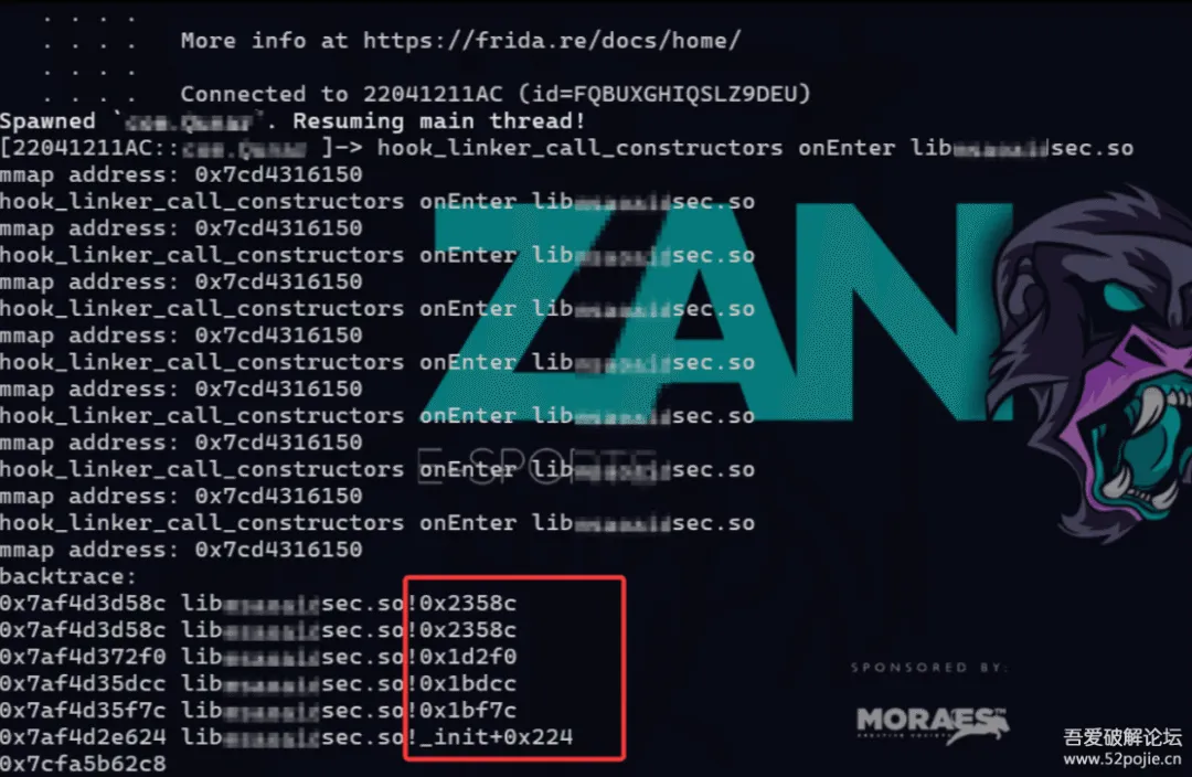 所以这里要搞懂这个函数中做了一件什么事,就得知道它调用dlsym获取了哪个函数的地址,从而进行使用,使用下列frida的脚本进行hook,同样是在call_constructors处做挂载: