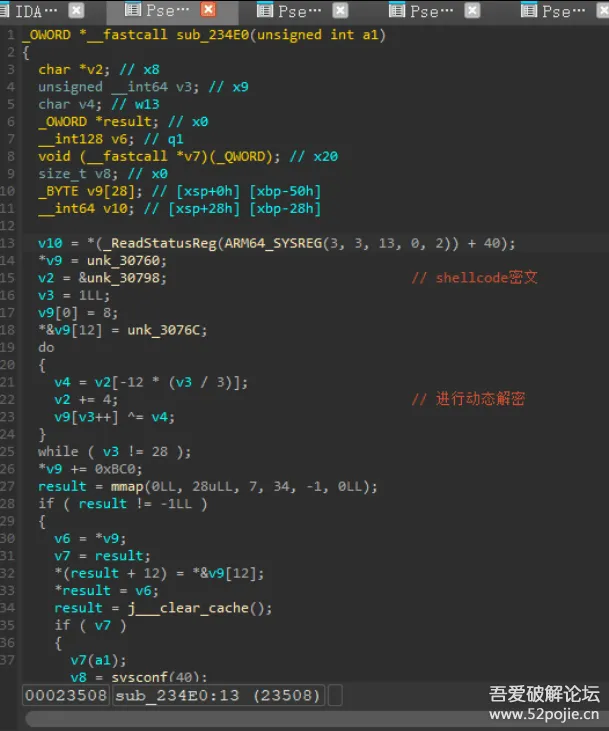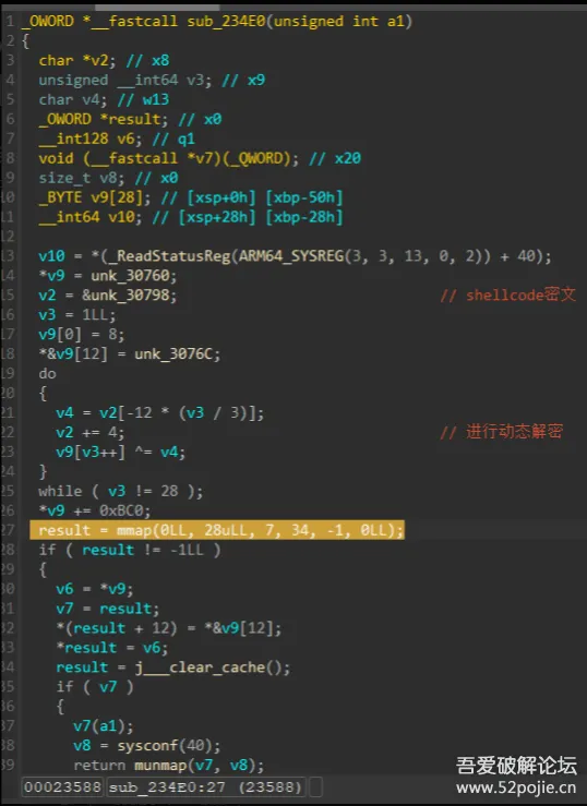 那么现在我们能够通过上述最后hook到的mmap调用的偏移定位到目标so中可能存在检测的位置,从而一步步往上交叉引用来进行分析,由调用栈的最顶层0x2358C可以跟到下图这个位置,可以大概看出似乎是在解密一段shellcode然后开辟内存来执行