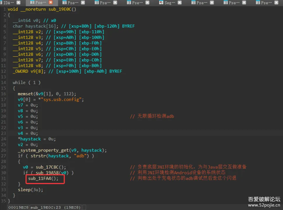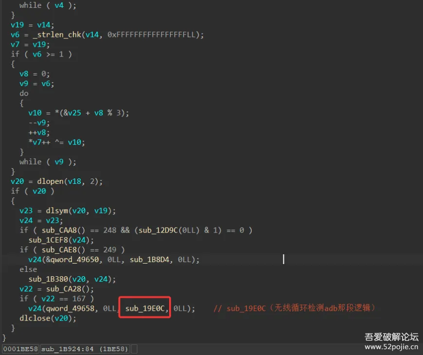 继续由函数sub_11FA4往上回溯,发现于函数sub_19E0C中出现一段无限循环持续检测设备是否处于ADB调试模式的逻辑,当在 sub_19E0C 函数中检测到ADB调试模式时,会调用sub_17C8C和sub_19A58这两个函数进行进一步的环境验证,如若被检测出来了的话直接走我们刚刚交叉引用上来的闪退逻辑。