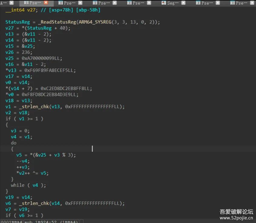 继续往上回溯,发现下面第二张图中调用了sub_19E0C,但是调用的方法有点奇怪,是作为v24函数的参数进行使用的,同时该段通过动态解密的操作,使用解密后的第一个字符串作为库名,调用dlopen动态加载该库,使用解密后的第二个字符串作为函数名,调用dlsym获取该函数地址,同时最后获取到的函数使用了sub_1B8D4和sub_19E0C作为参数,sub_19E0C是我们回溯上来的引线。