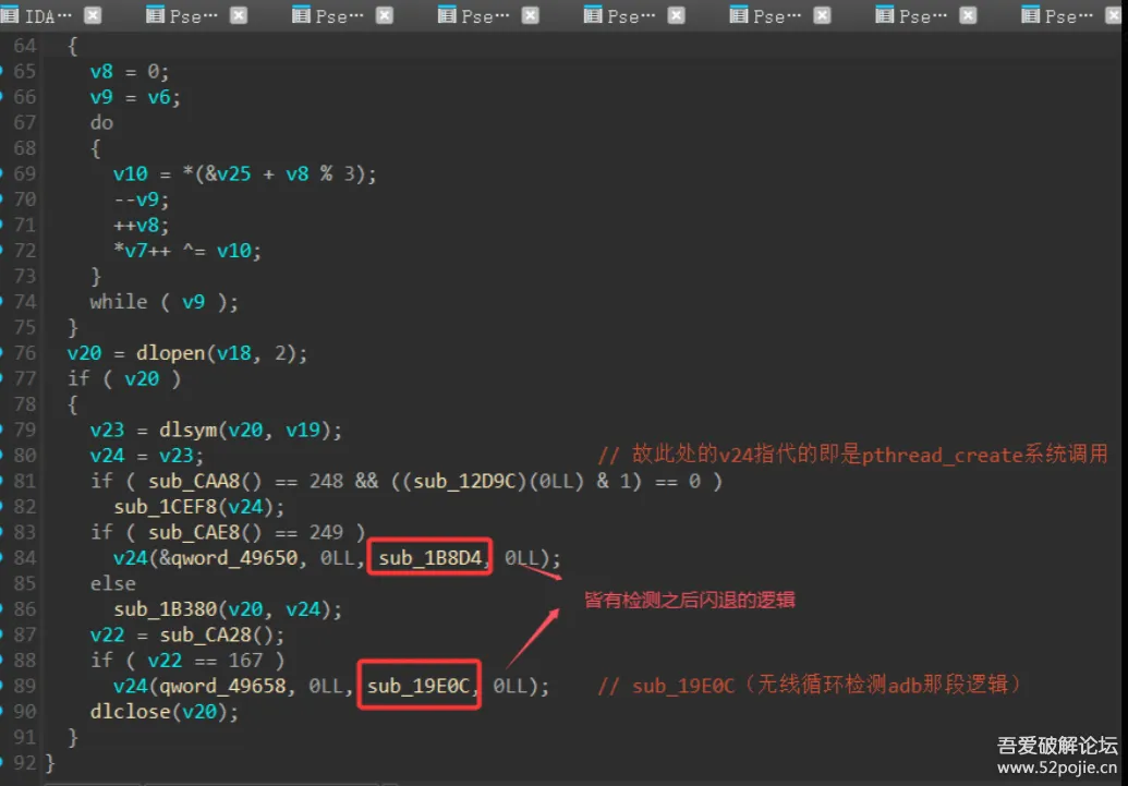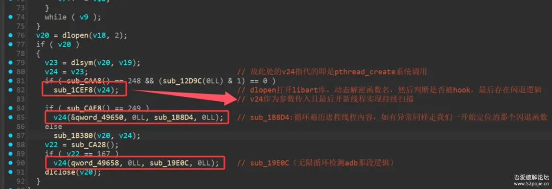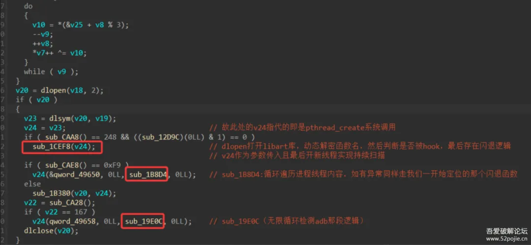 那么这段逻辑就稍微明了了,sub_1B924中动态解密了库名libc.so和函数名pthread_create,开创了两个检测的线程
