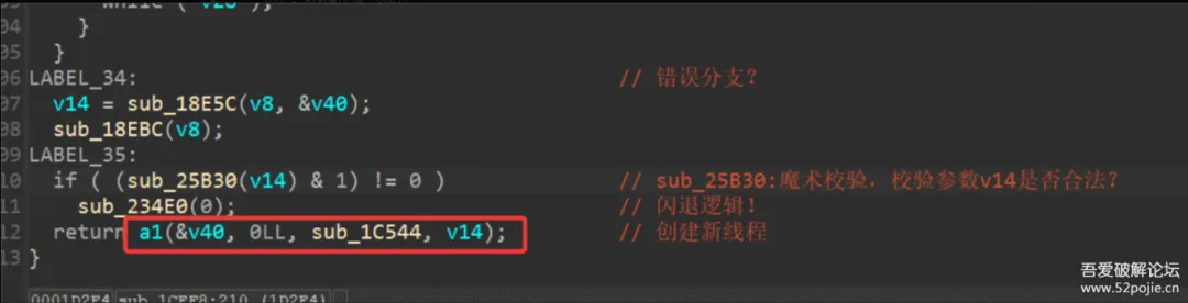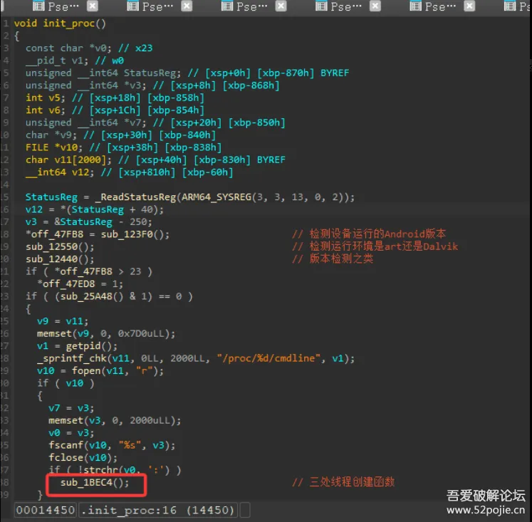 那么此时我们继续沿着上图有三处创建新线程的框架函数继续往上回溯,发现到达了init_proc,也就是so加载之后走的第一个流程块,其中框出来的即是我们上图中的内容,因此我们可以根据造成程序异常退出的这三处创建处以及根据创建线程必走的一些系统调用来bypass掉这个检测由上述分析我们可以得知,三处创建线程逻辑的地址,分别于sub_1BEC4函数中建立,根据上文中的详细描述可以锁定到这几处可以知道创建线程之后执行的函数分别是sub_1B8D4、sub_19E0C、sub_1C544,故而可以直接将几个线程执行的函数直接patch掉,实现绕过,但是是有下列脚本之后还是被杀掉了: