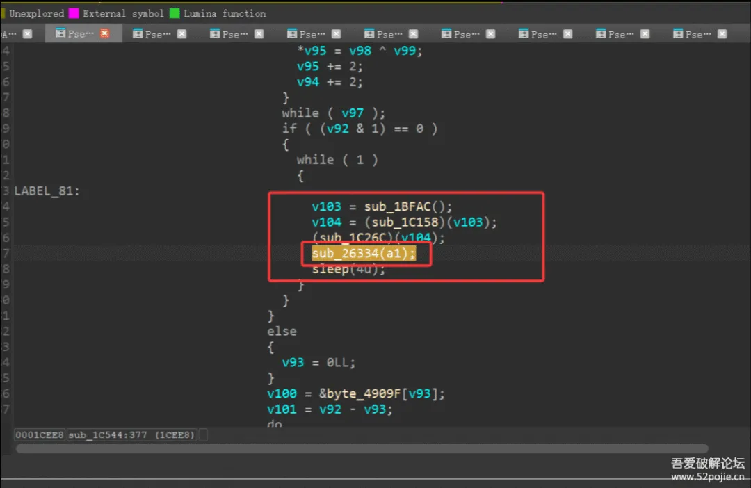 然后发现在线程函数sub_1C544中对应执行类似的持续扫描闪退的操作的函数应该是sub_26334数。
