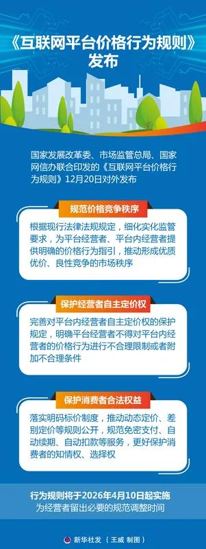 4月10日,由国家发改委、市场监管总局、国家网信办联合制定的《互联网平台价格行为规则》正式施行。这是我国首部专门针对互联网平台价格行为的部门规章,"大数据杀熟""虚假满减""自动续费套路"等乱象被明确定性为违法。