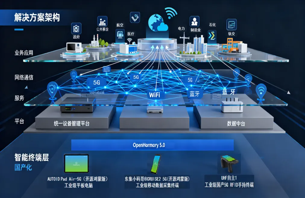 1.技术架构领先:完成OpenHarmony 5.0在工业终端的深度适配与全栈技术整合,实现软硬件国产化,并构建了涵盖企业桌面、开源鸿蒙企业级应用商店及系统安全防护的完整软件生态,为信创迁移提供成熟底座。