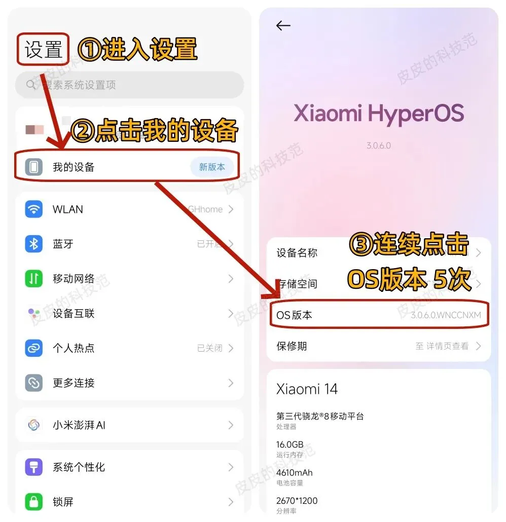 澎湃OS系统手机进入设置-我的设备,在OS版本处连续点击5次,会显示开发者模式已经打开。