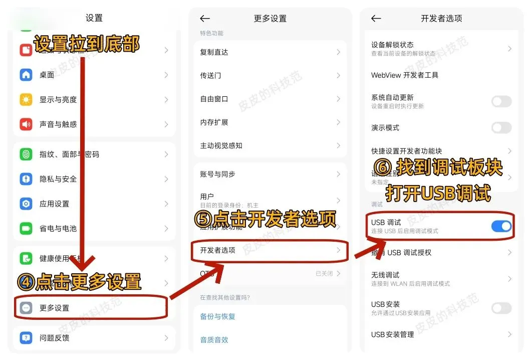 打开开发者模式后,回到设置页面,拉到底部会看到更多设置,拉到底部点击开发者模式,找到调试板块,将USB调试打开。