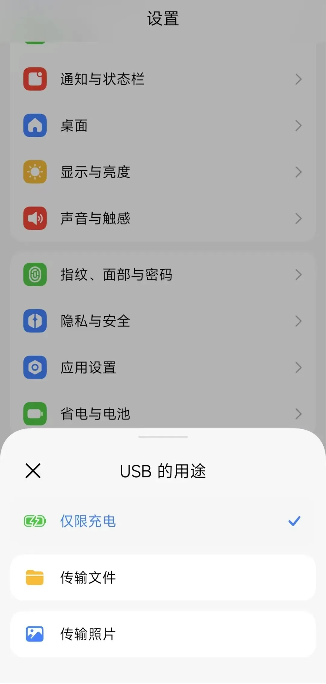 ①将手机使用数据线连接电脑,并在手机弹出的USB的用途,此时充电模式和传输文件均可