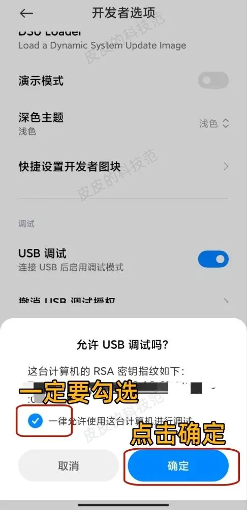 ②【重要】在USB调试状态开启状态下,连接电脑与手机,手机端会弹出询问:是否允许设备进行USB调试?一定要勾选一律允许,并点击确认。