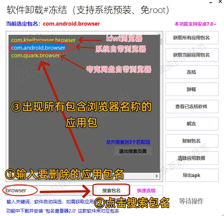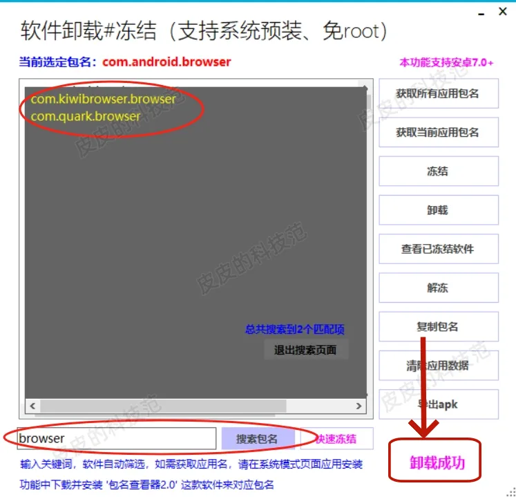 ②选择第二个应用包,点击卸载,等待右下角的卸载成功字样出现,就完成了卸载,再次点击搜索包名,会只剩下两个浏览器应用包——