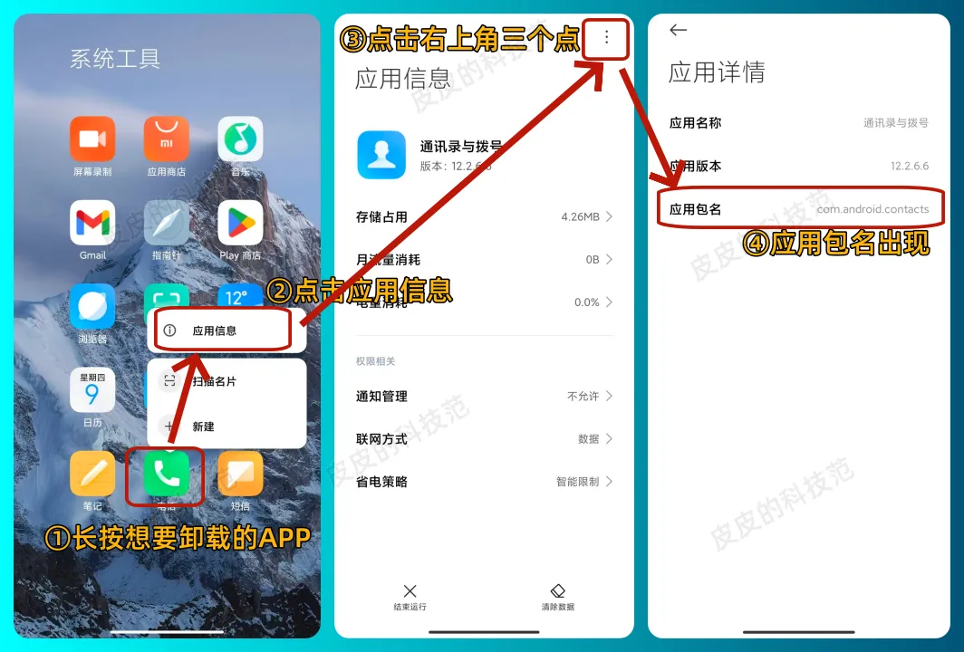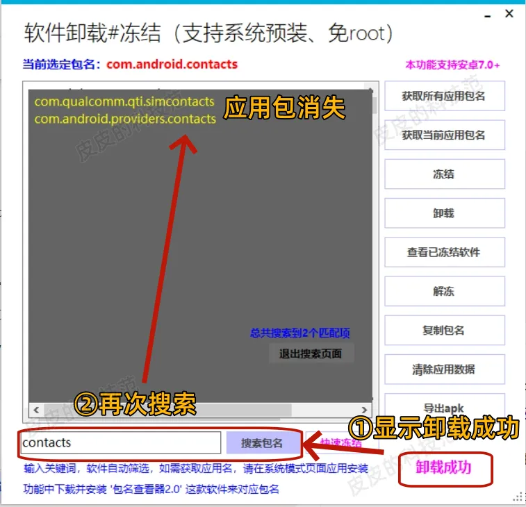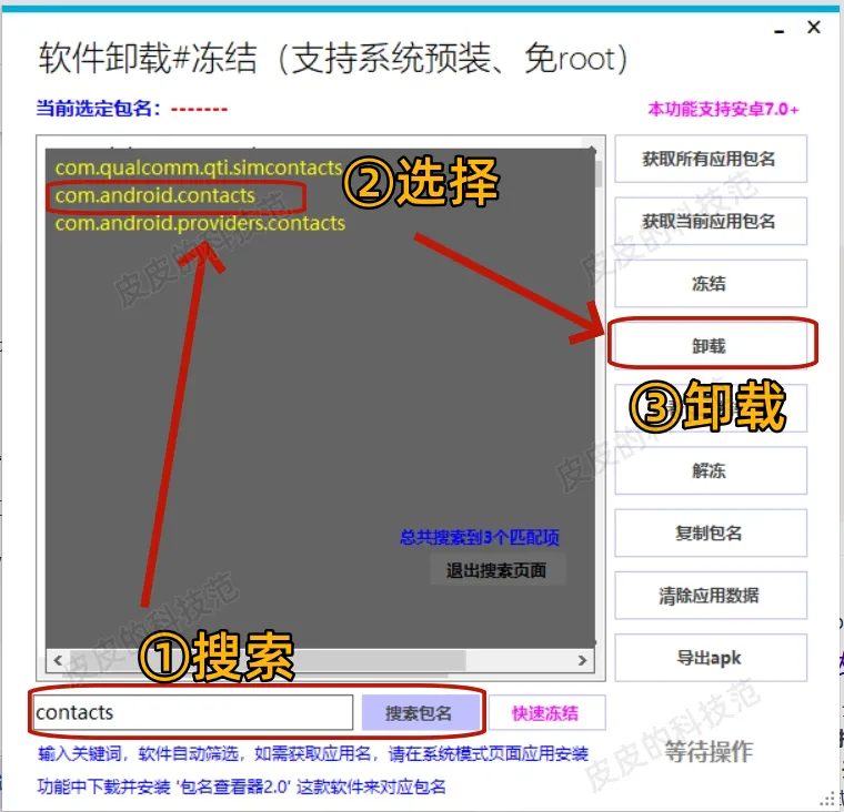②搜索包名contacts,同样出现三个应用包名,根据上图的应用包选择第二个,点击卸载