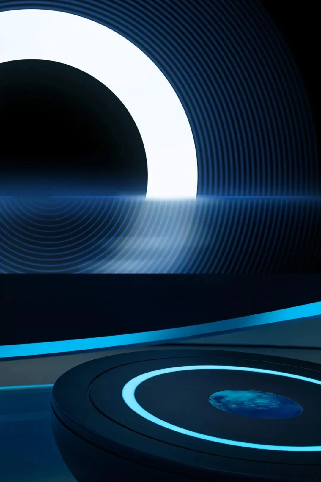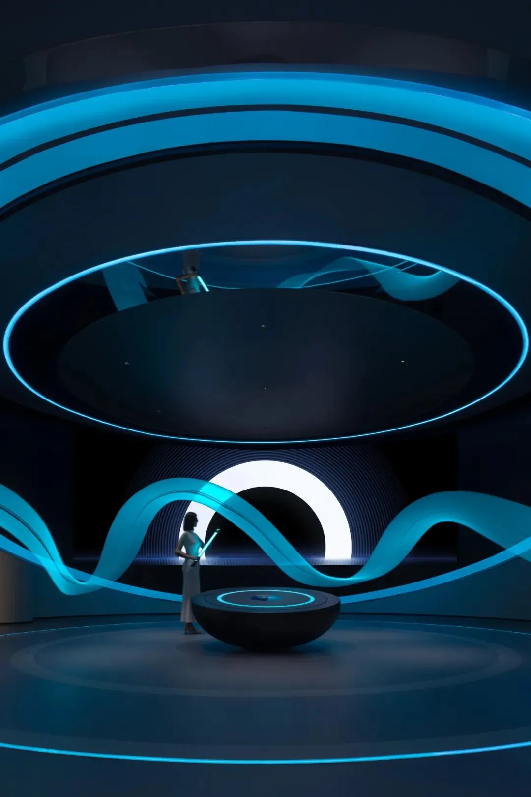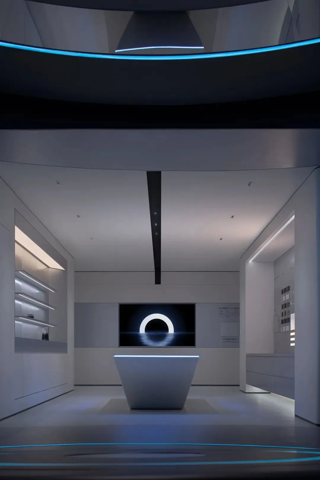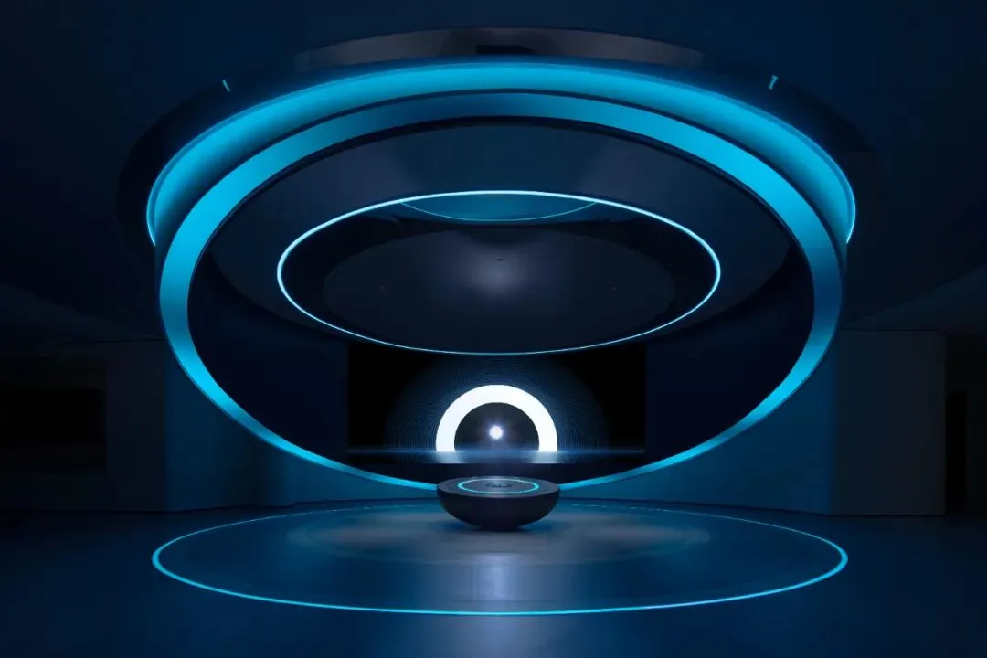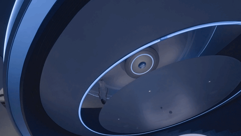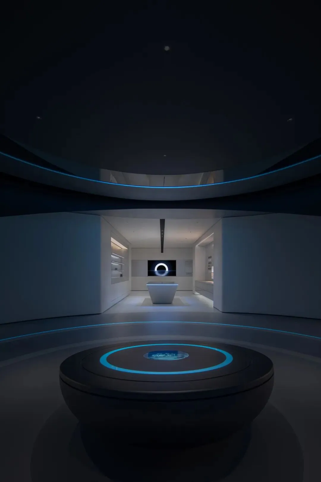 设计师嵌入了一圈一圈环形光带,有的宽而柔和,如同月晕,有的窄如细条,更为凝聚,有的只能瞥见微光。不同的光圈,让这个圆形结构充满了科幻的意味。