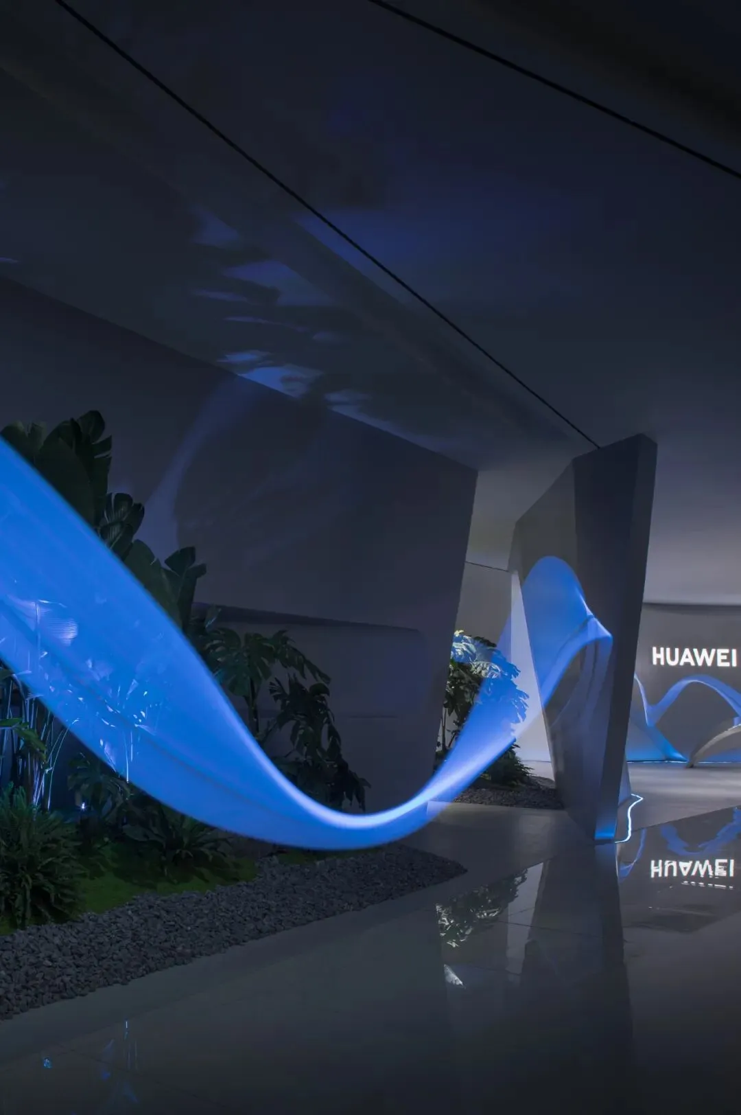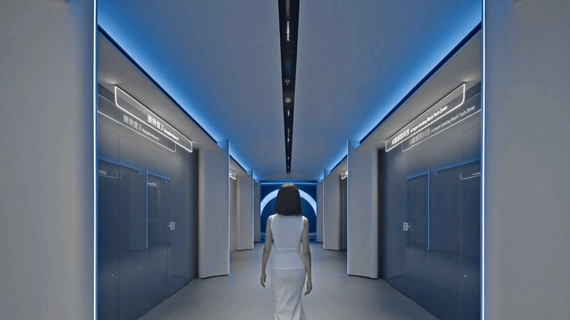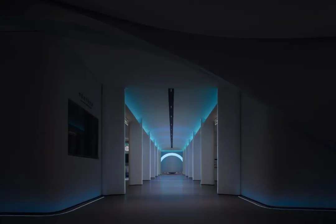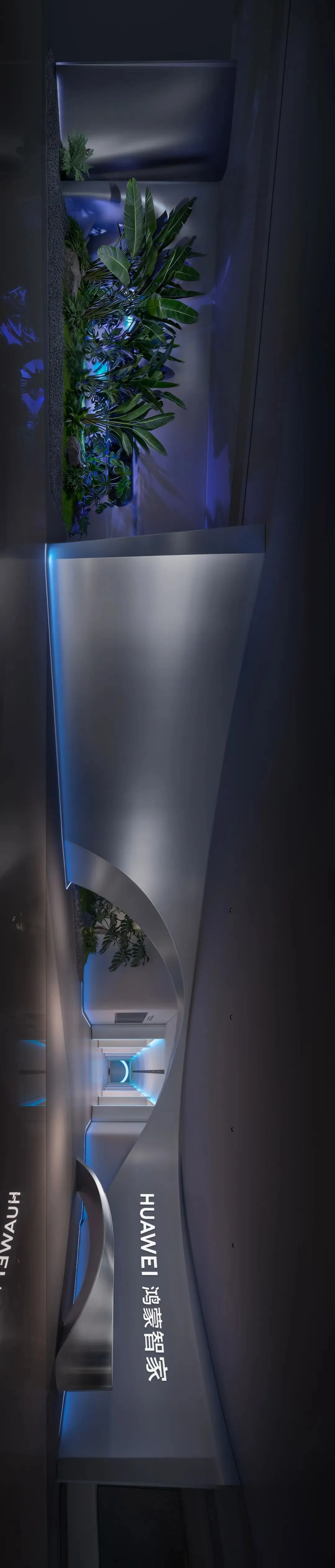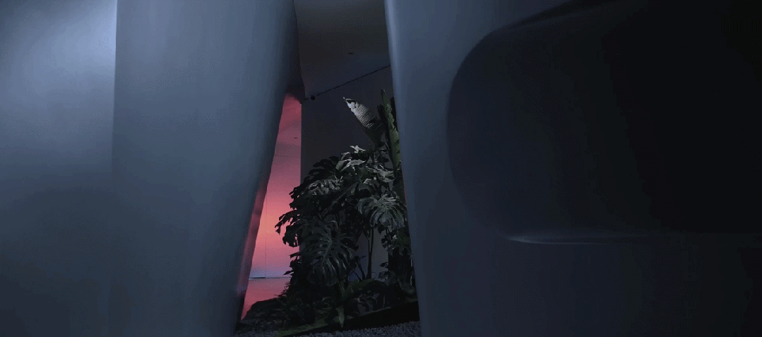 在入口的左侧,我们种下了一方真实生长的自然绿洲。高大的植物与错落的苔藓景观,在柔和的照明下,投下斑驳的阴影。植物的枝叶从流线型的墙体中生长而出,模糊了人工与自然的边界。这抹生机盎然的绿,与冷静的科技形成微妙的对话,寓意着展厅的内核,万物同生共长的自然秩序。