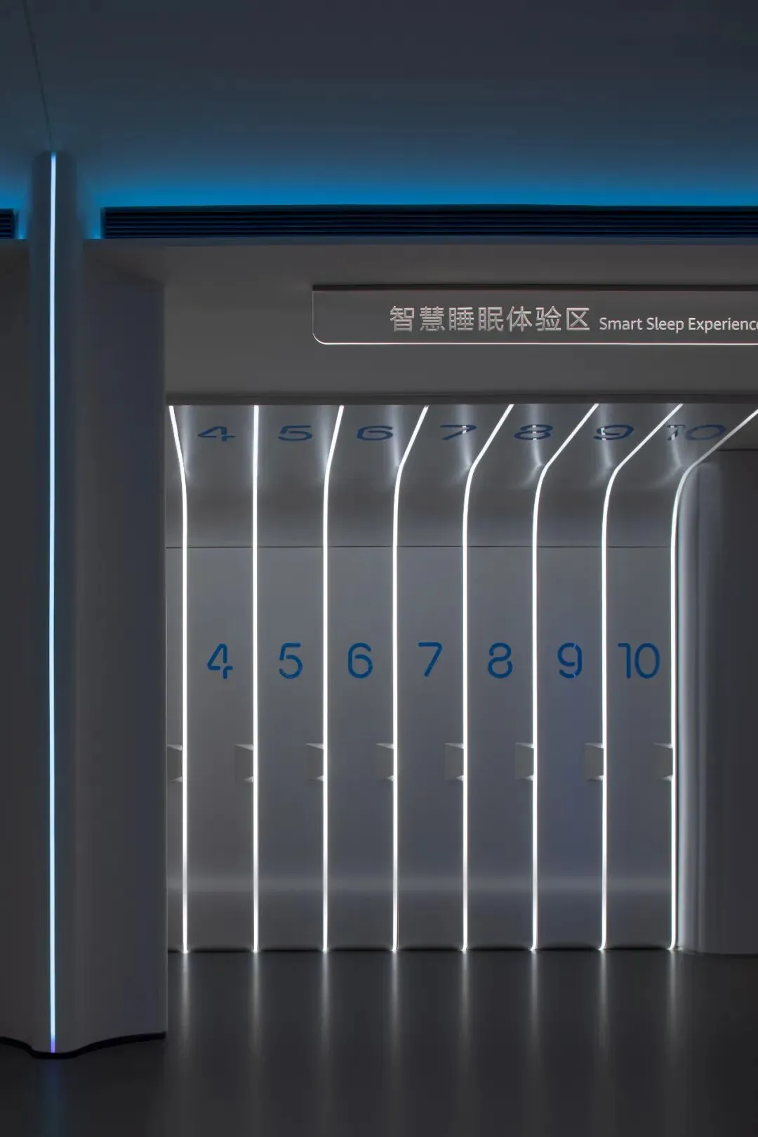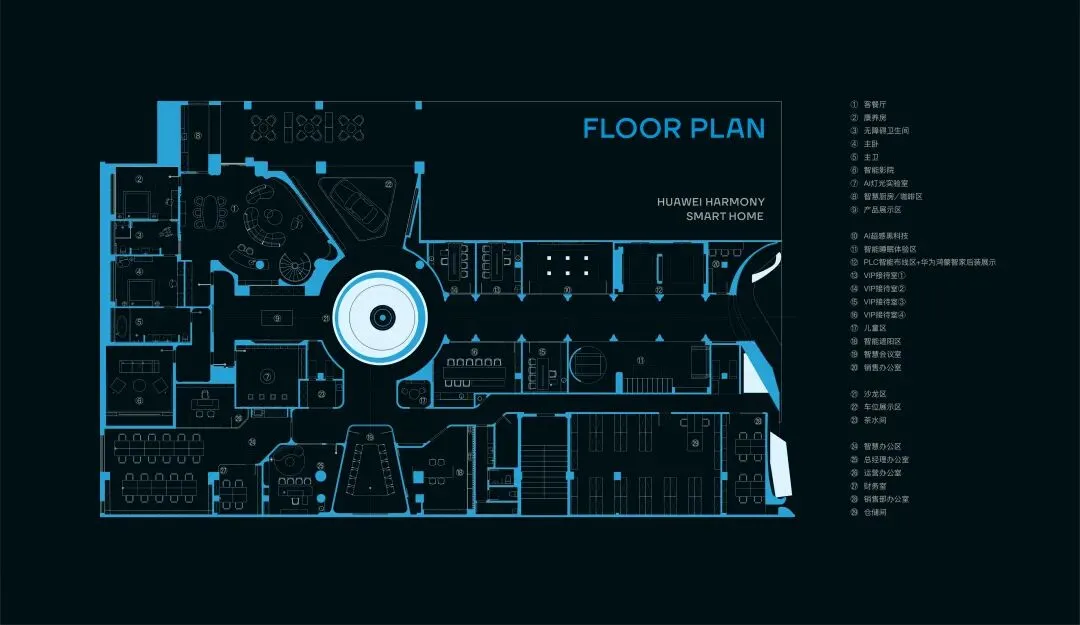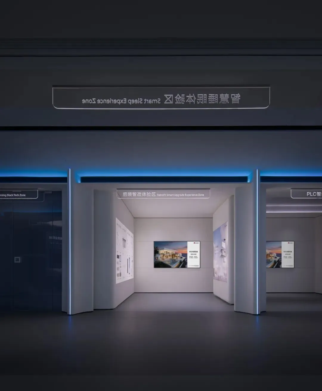 在山海鸿蒙轴的两侧,空间以对称的格局缓缓展开,分布着几个沉浸式的体验空间:AI超感黑科技体验、智能睡眠体验区、后装智改体验区、PLC智能布线区等空间……