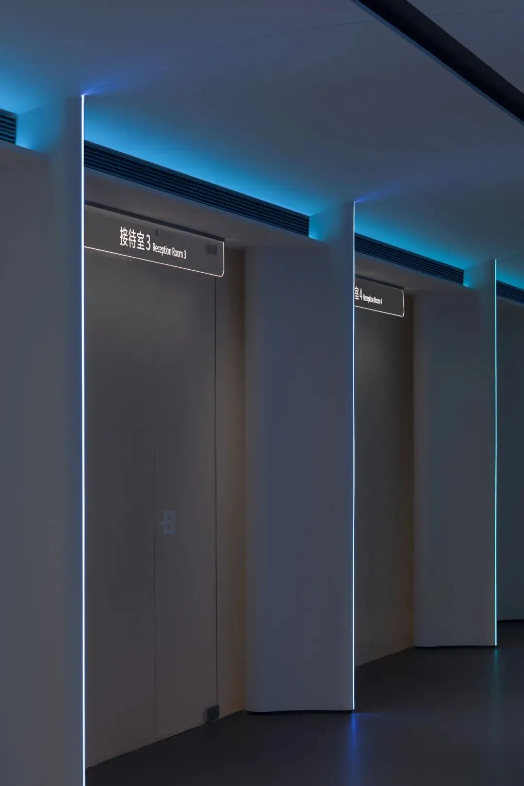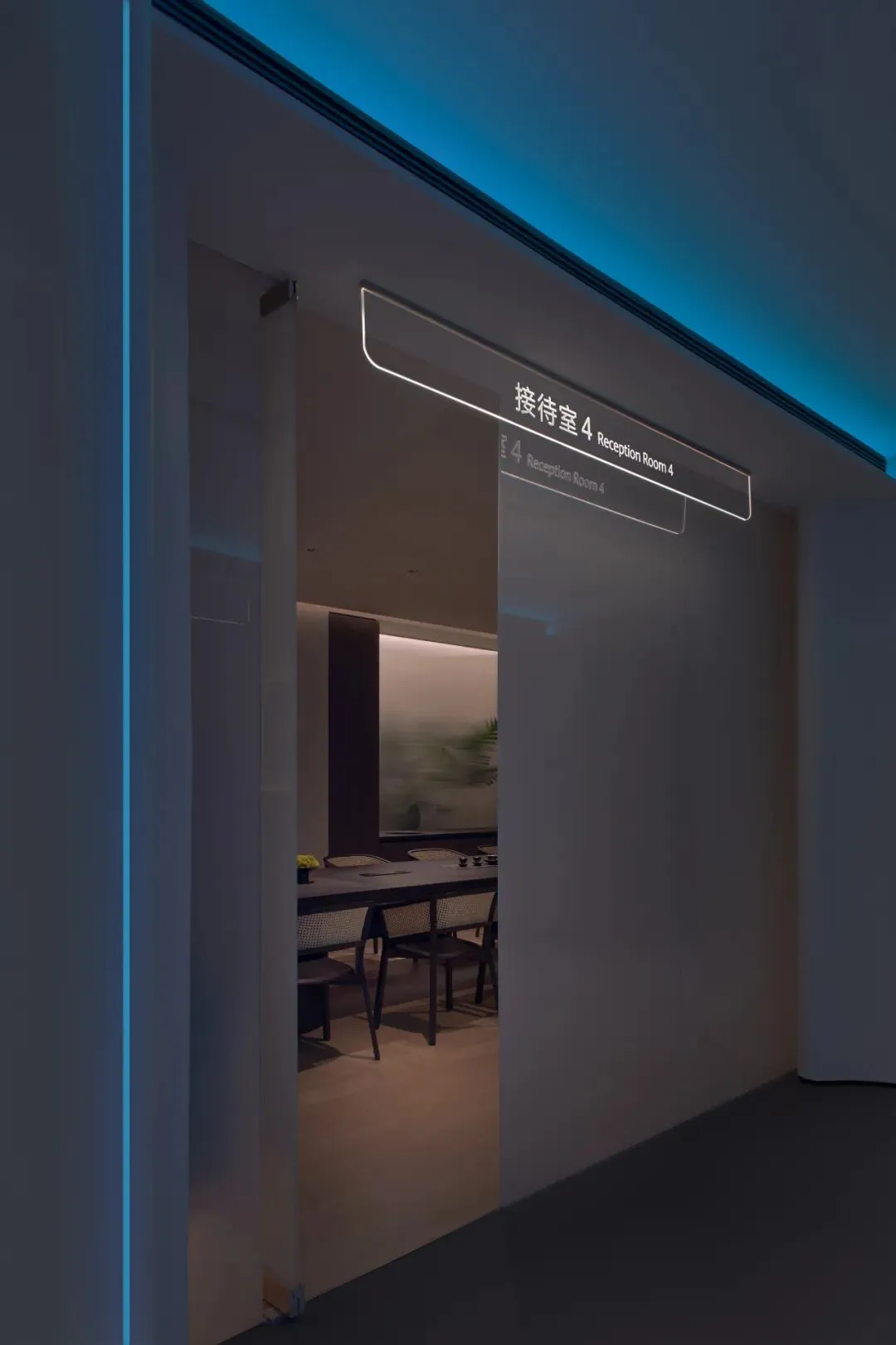 贯穿整个公共区的“山海鸿蒙轴”是精心编排的仪式,随着行走,人从外部世界,逐渐沉入空间的叙事之中。两侧的墙体向外开启,如同相向的山峦,将视线自然地引向前方。墙体上暗藏的光带缓缓亮起,沿着曲面晕开,引导着脚步,也安抚着心神。