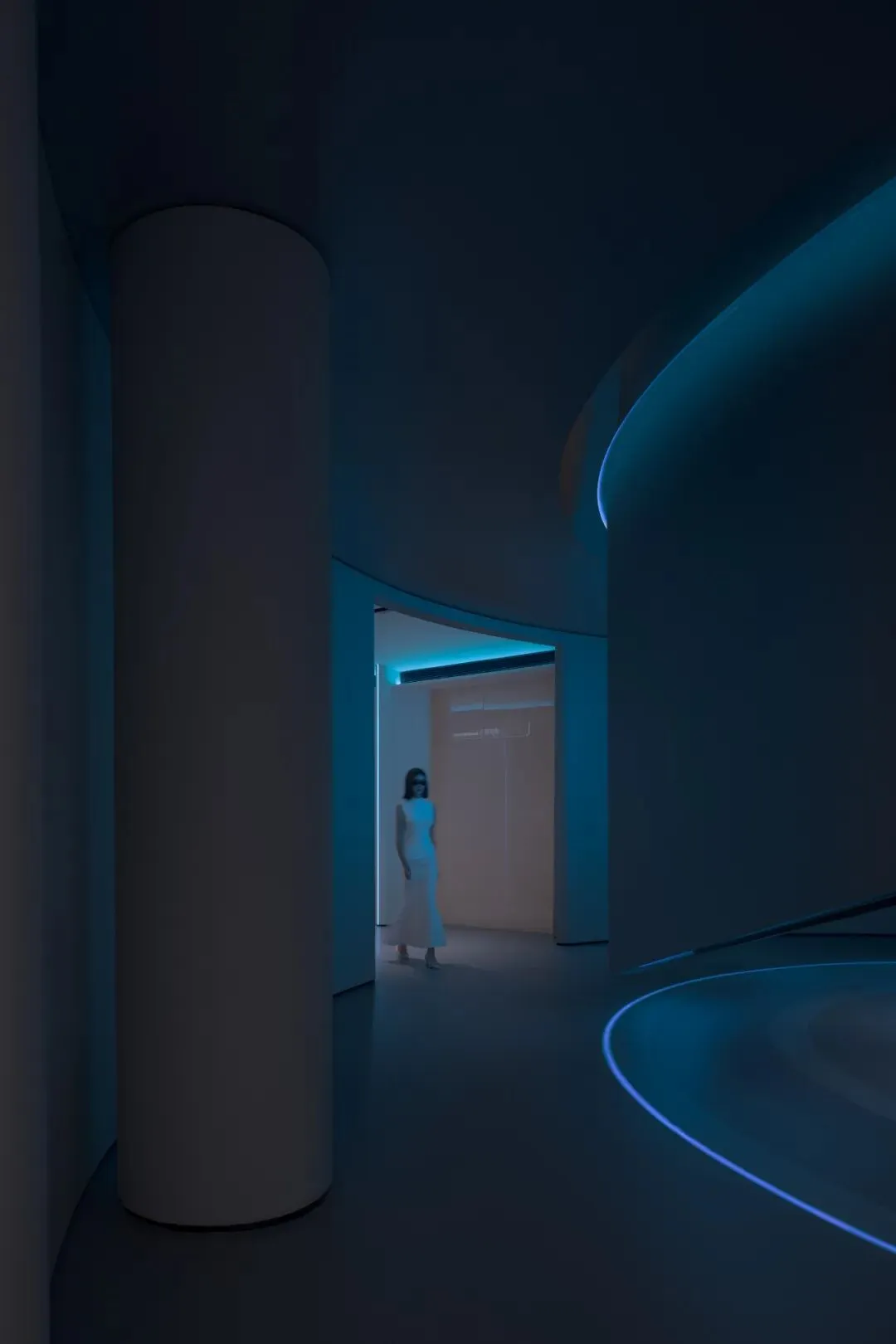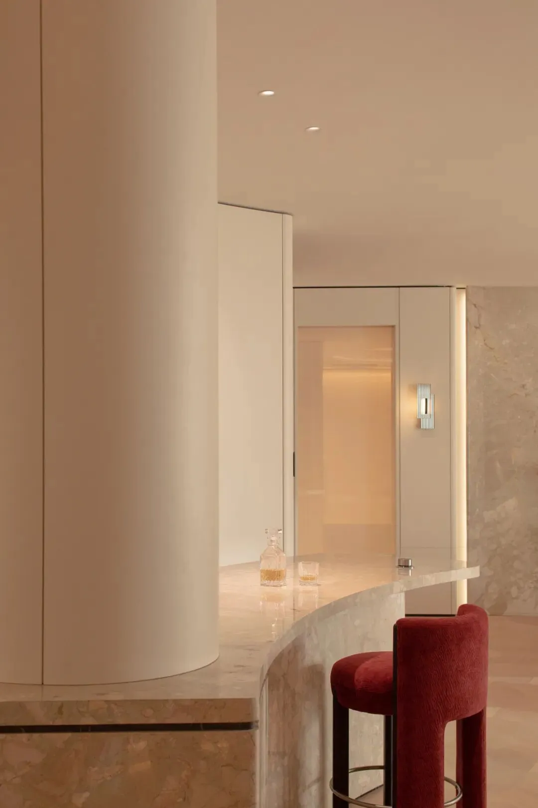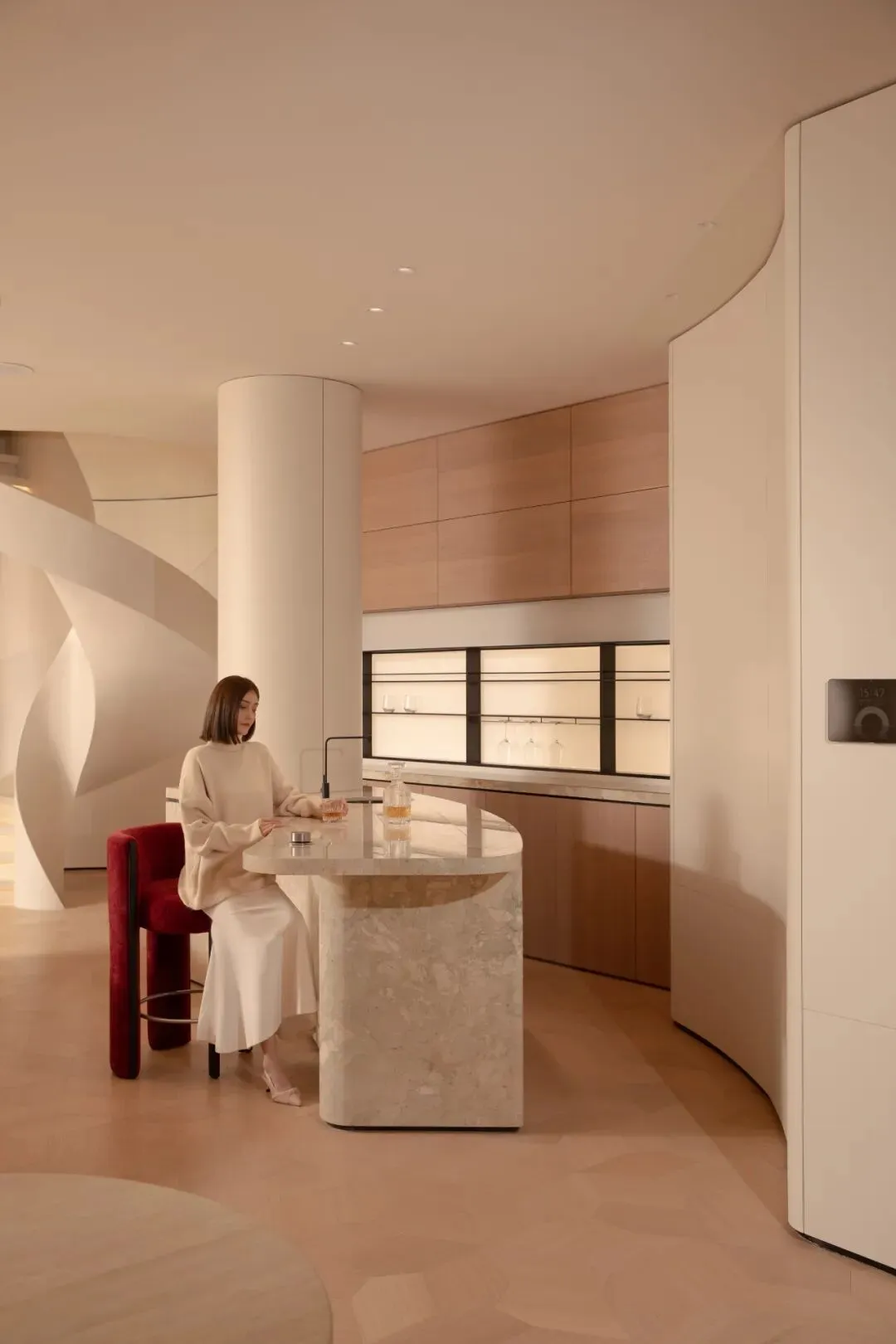 在这条轴线的尽端,一面巨大的圆形墙体从顶部延伸而下,以其完美的弧线,为整条轴线画下了句点,与地面的圆形相接,共同围合出一个神秘的、向内聚拢的空间。沙龙公共区域成为了一个可供等候、交谈、阅读、独处的复合型空间。