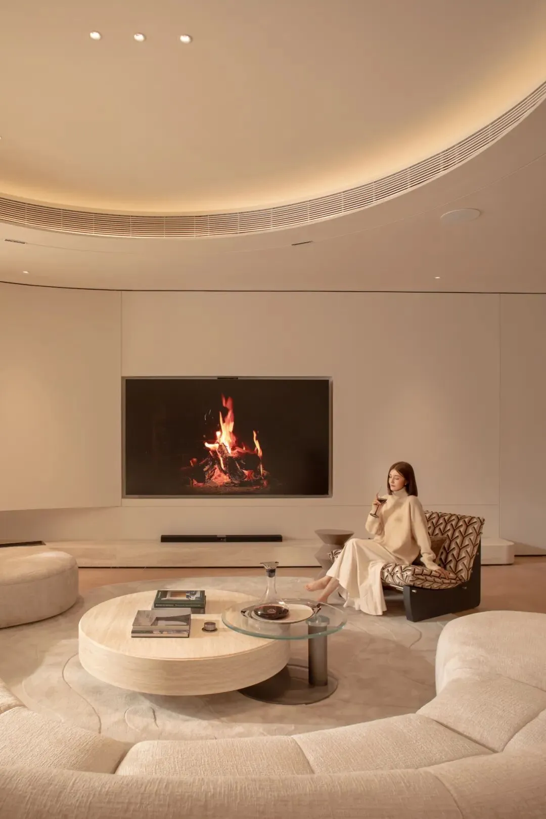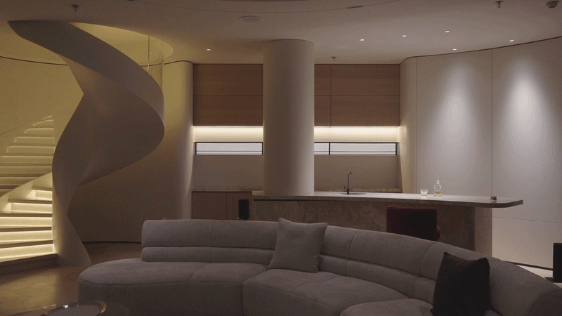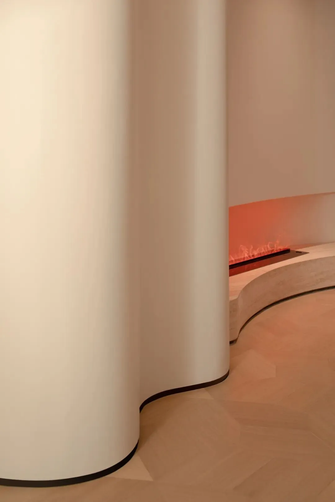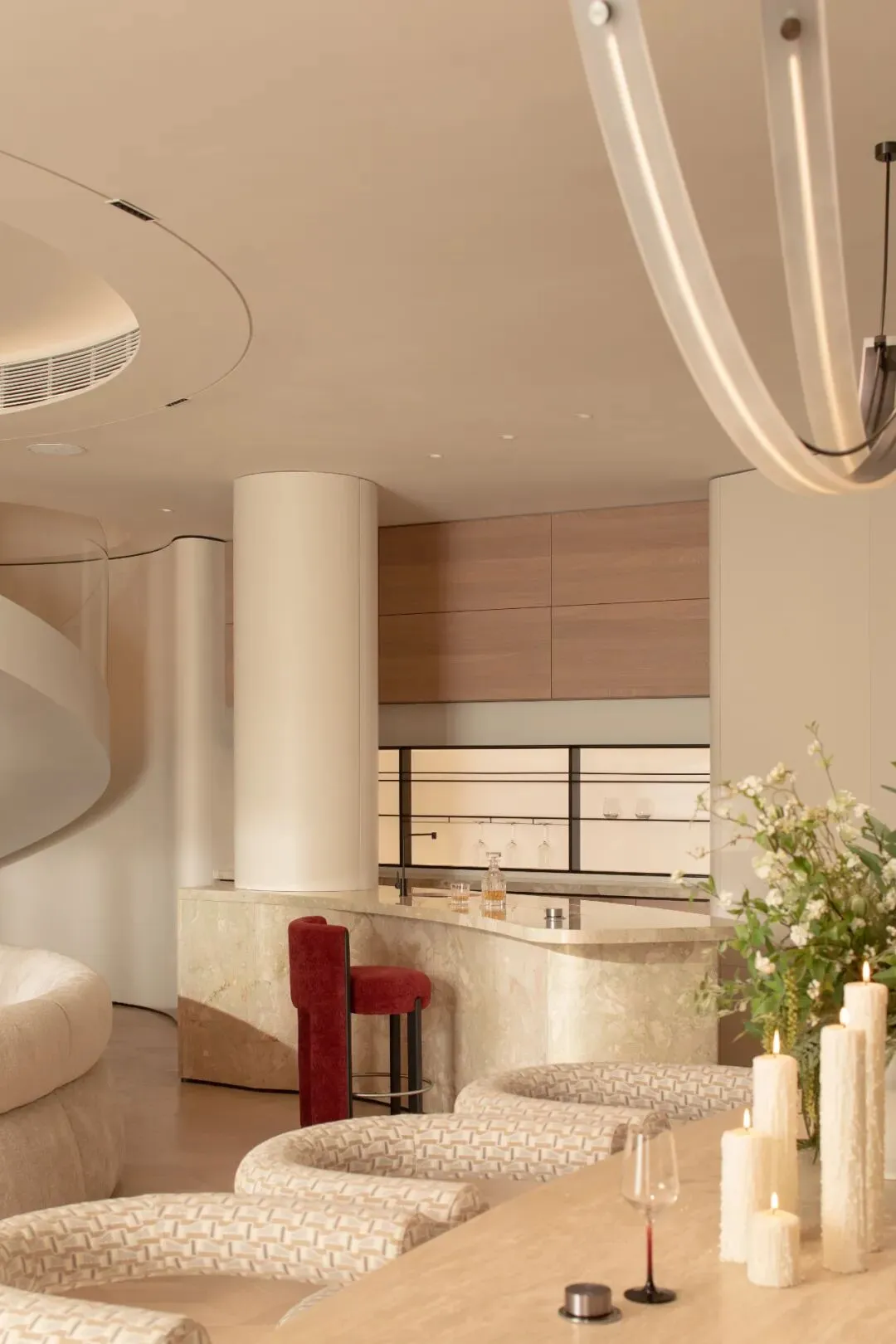 在这条轴线的尽端,一面巨大的圆形墙体从顶部延伸而下,以其完美的弧线,为整条轴线画下了句点,与地面的圆形相接,共同围合出一个神秘的、向内聚拢的空间。沙龙公共区域成为了一个可供等候、交谈、阅读、独处的复合型空间。