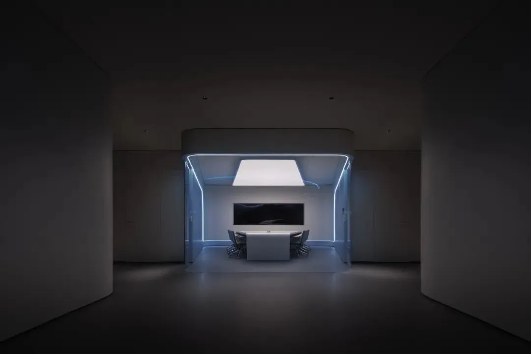 沙龙区像一个圆形的中岛,静静地泊在展厅中心。开口如同山峦之间的隘口,既保持了空间的围合感,又允许视线与光线自由地穿行。每一次进入,都是一次被拥抱的体验。