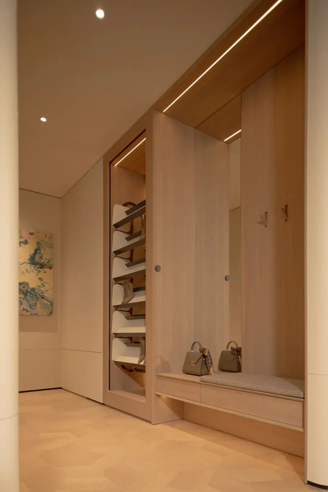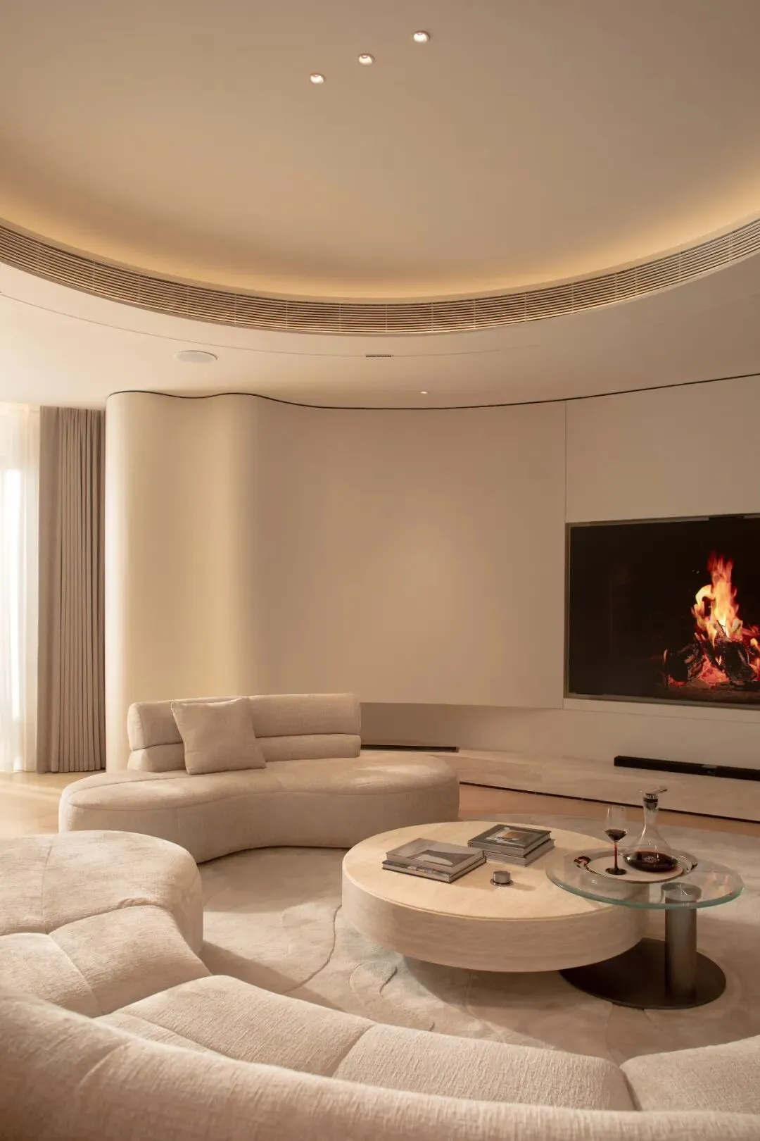 整体以温暖的米色和木色调为基底,公共区域充满张力的曲线,流到了这里,变得舒缓而绵长。每一个转角都是圆润的,每一道弧线都是柔和的,让人一走进去,就不自觉地放慢了脚步,放松了身体。