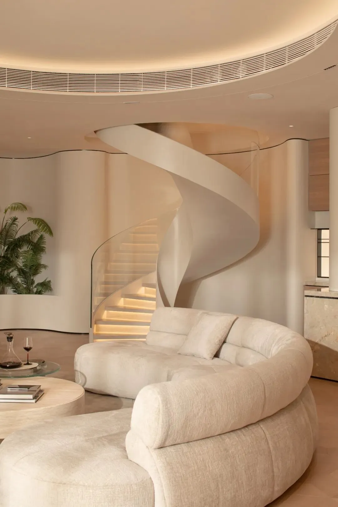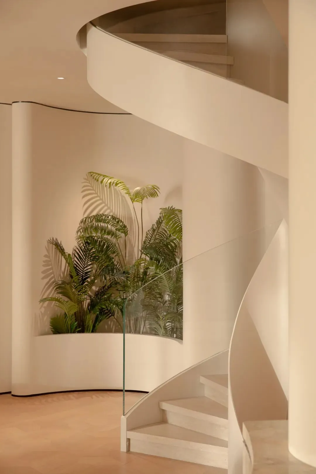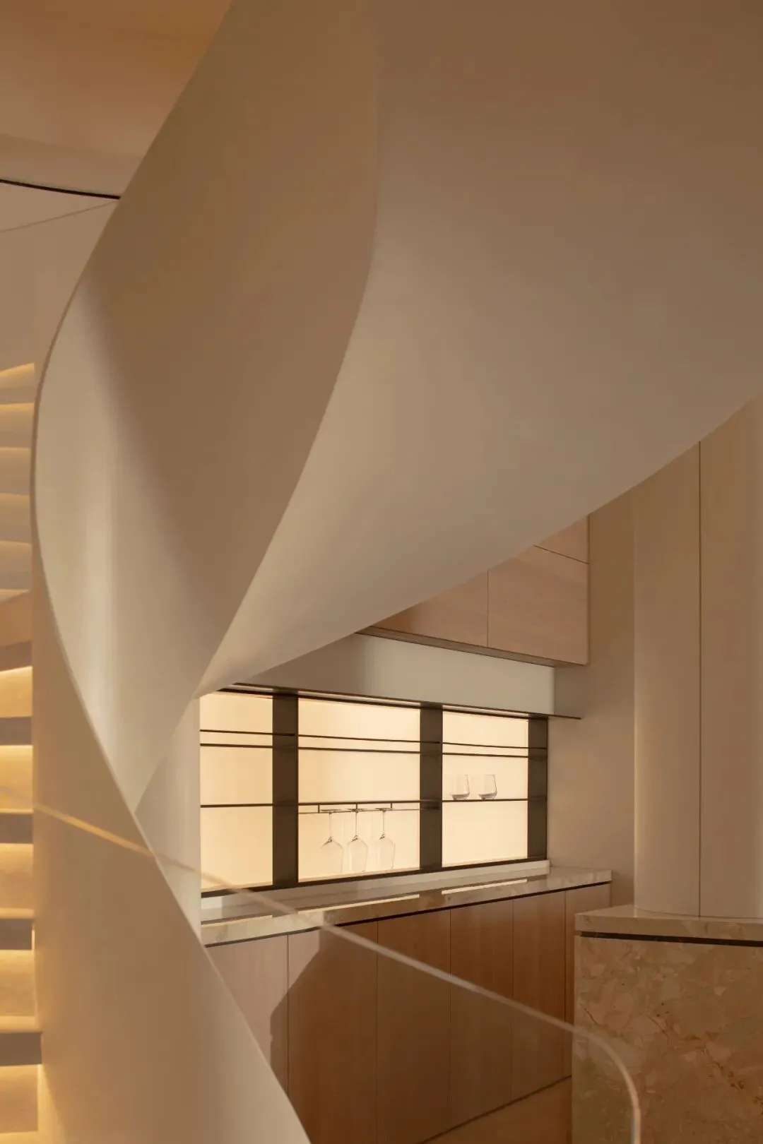 一道蜿蜒的旋转楼梯从地面盘旋而上,白色钢板与玻璃扶手是空间里最优雅的存在,在光带的勾勒下,成了一道盘旋向上的光之轨迹。