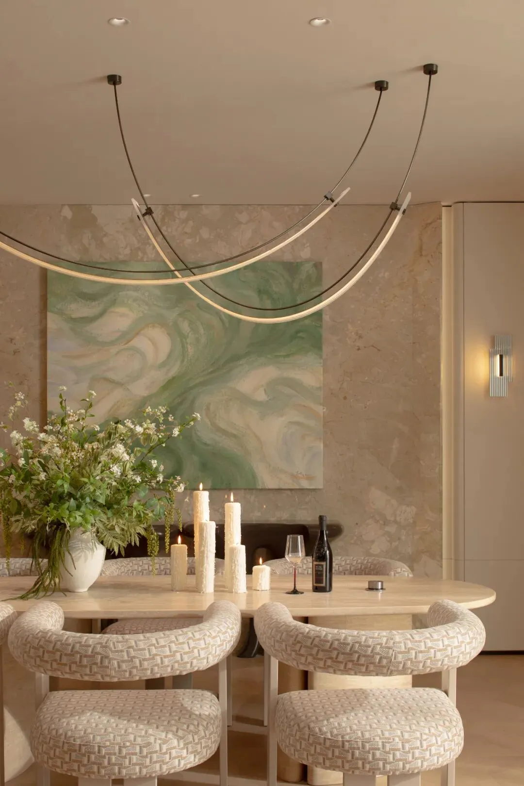 餐桌的形态是柔和的椭圆形,每一个边角都被打磨得圆润光滑。当手不经意间拂过桌沿,触感温润如玉。流体线性灯以不同的高度从天花板垂下,光线在桌面上交织成一片柔和的光晕。