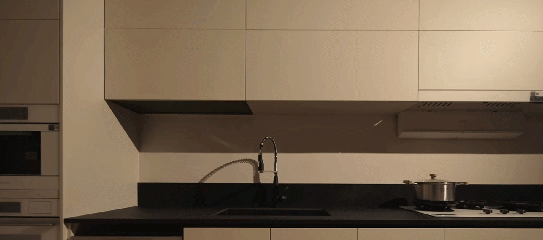 厨房的智慧,不在那些需要学习的操作里,当灯光缓缓亮起时,柜体自动打开,需要的调味品轻轻呈现于眼前,一日三餐的琐碎变得更加轻省。科技在看不见的地方给予便捷、安全,把烹饪的专注、相聚的快乐完整的留给人 ,生活自然流淌,人也被空间关怀。